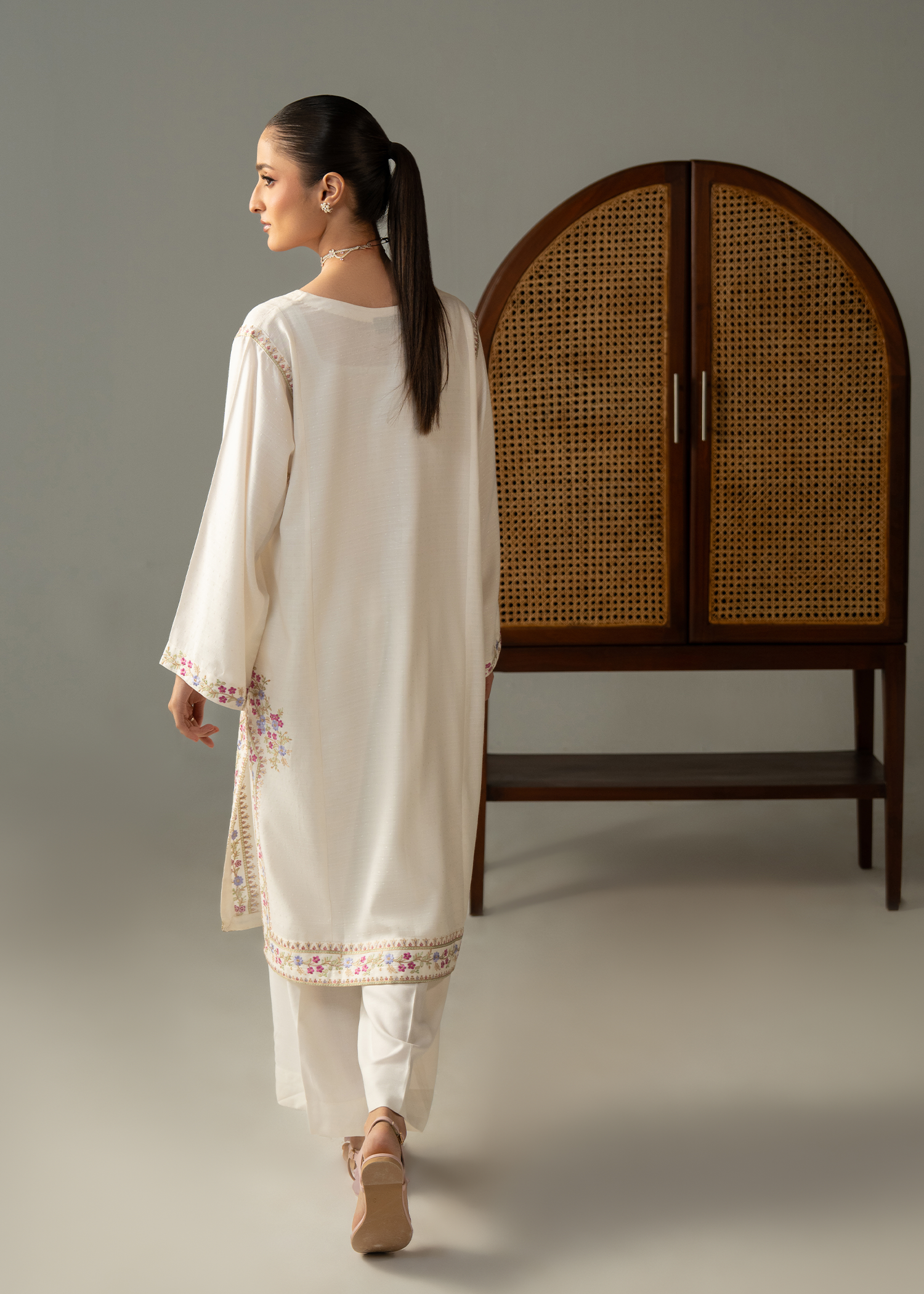 This exquisitely crafted dhanak shirt is adorned with intricate multicolor embroidery, a great addition to your winter wardrobe. Paired with sleek, straight-cut trousers, this outfit offers the perfect blend of elegance and comfort.