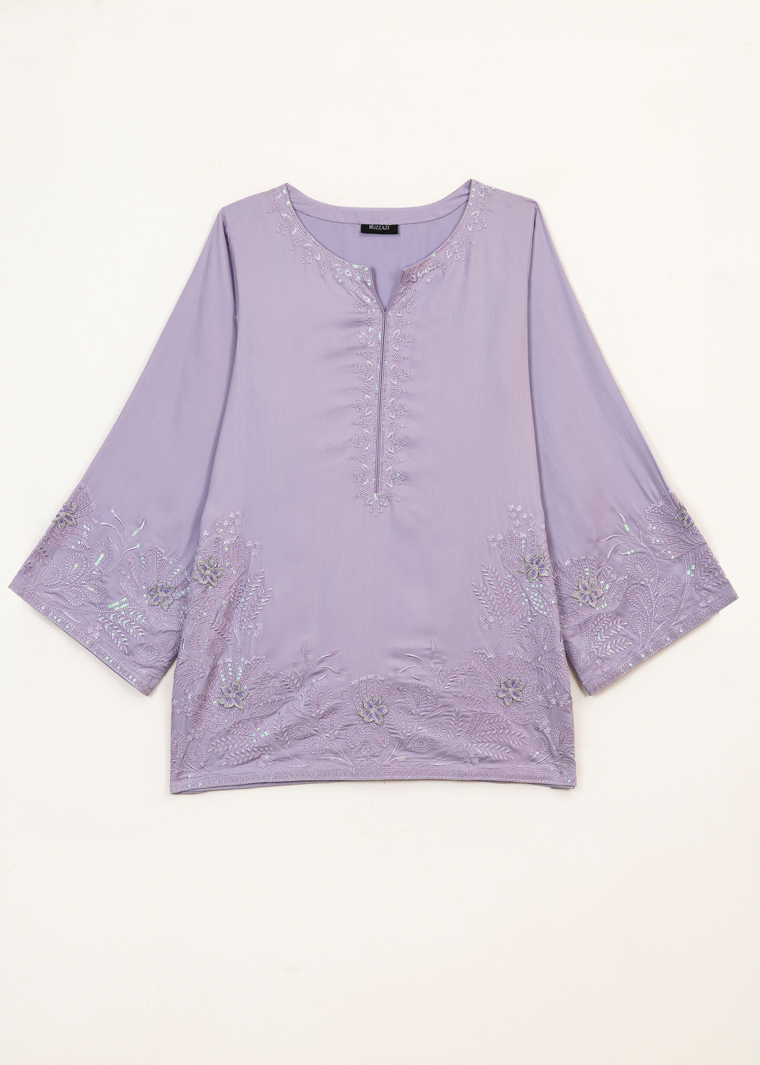 A luxurious two-piece tussar silk suit featuring a short shirt paired with a flowing farshi shalwar. The shirt is adorned with delicate floral embroidery along the hem, borders, neckline and sleeves, accentuated with sparkling sequins and intricate 3D floral motifs—creating a look of timeless elegance and refined sophistication.