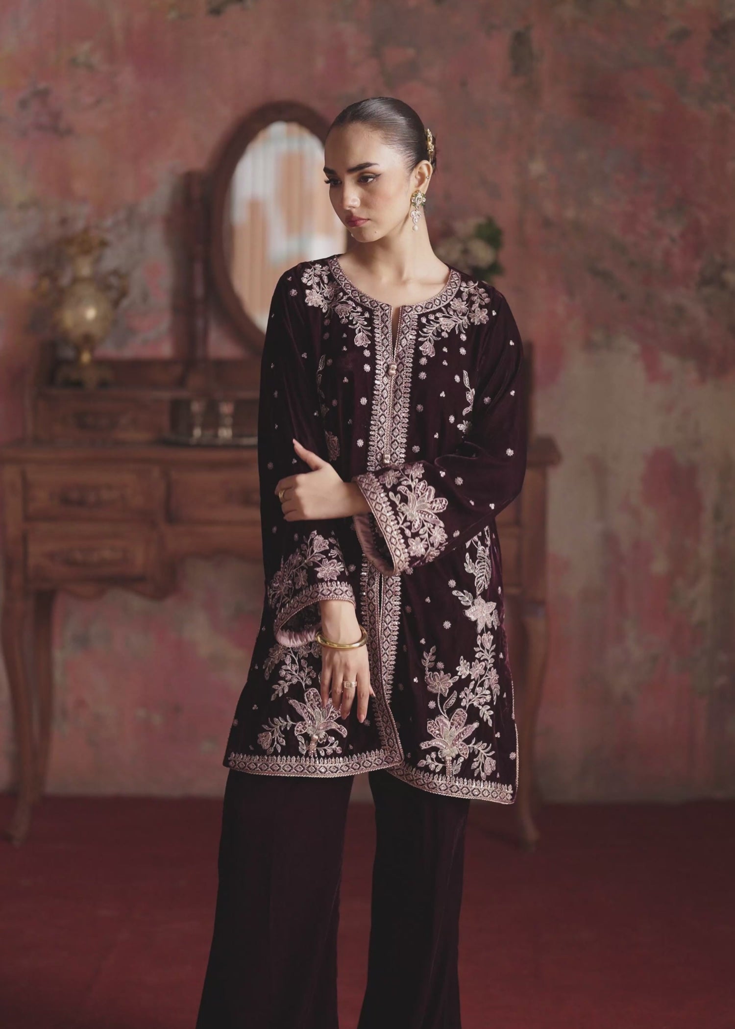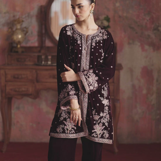 Step into refined elegance with this purple short shirt, paired with chic bootleg trousers for a contemporary silhouette. The outfit is beautifully adorned with tilla and sequin embroidery, enhanced further with delicate 3D floral appliqués, tilla pearls, and intricate lace detailing. Every element is thoughtfully designed to add dimension and charm, making it an ideal choice for festive events where subtle glamour is key.