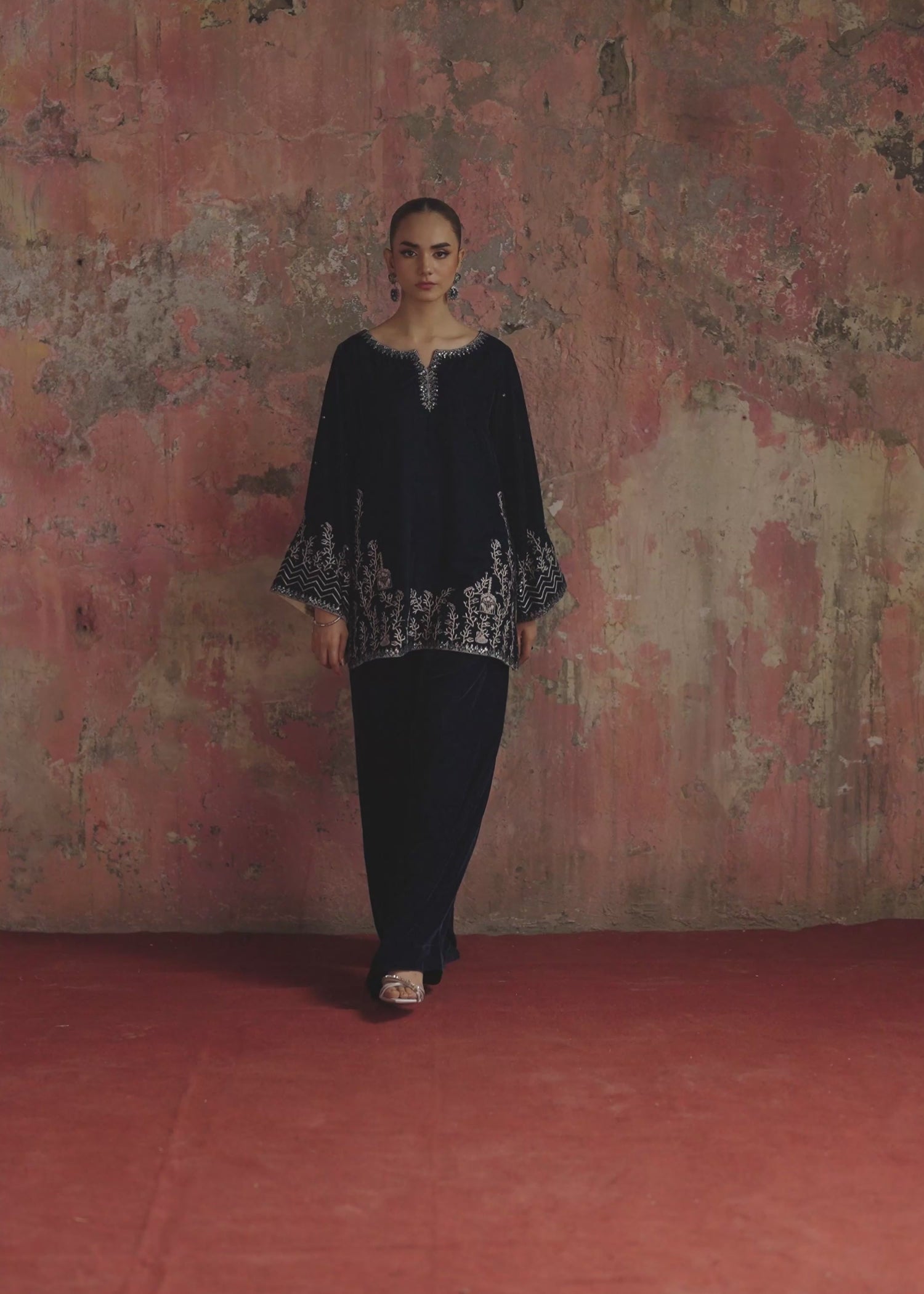A masterpiece in black velvet, this kaftan is elevated with a striking non-traditional color palette that redefines festive elegance. The sleeves, hem, and neckline are richly embroidered, each detail reflecting meticulous craftsmanship. Tilla work is artfully applied to create the refined effect of cord-style embroidery, adding depth and dimension to the design. Crafted for the woman who dares to embrace distinction.