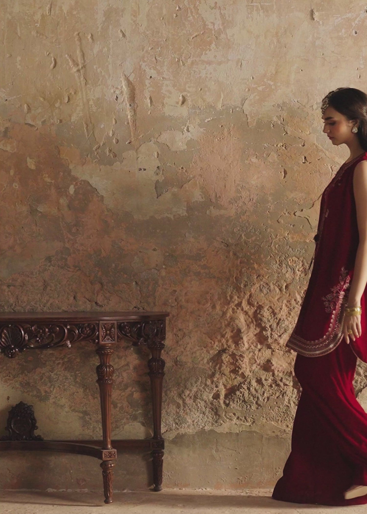 Turn heads with this striking short red velvet kameez, beautifully adorned with intricate tilla and sequin embroidery. The design is further enhanced with playful tassels and delicate 3D butterfly embellishments, adding a whimsical yet elegant flair. Paired with a flowy wide-leg sharara, this ensemble is perfect for celebratory gatherings. Comes with matching sleeves that can be attached as per your preference, offering versatility in styling.