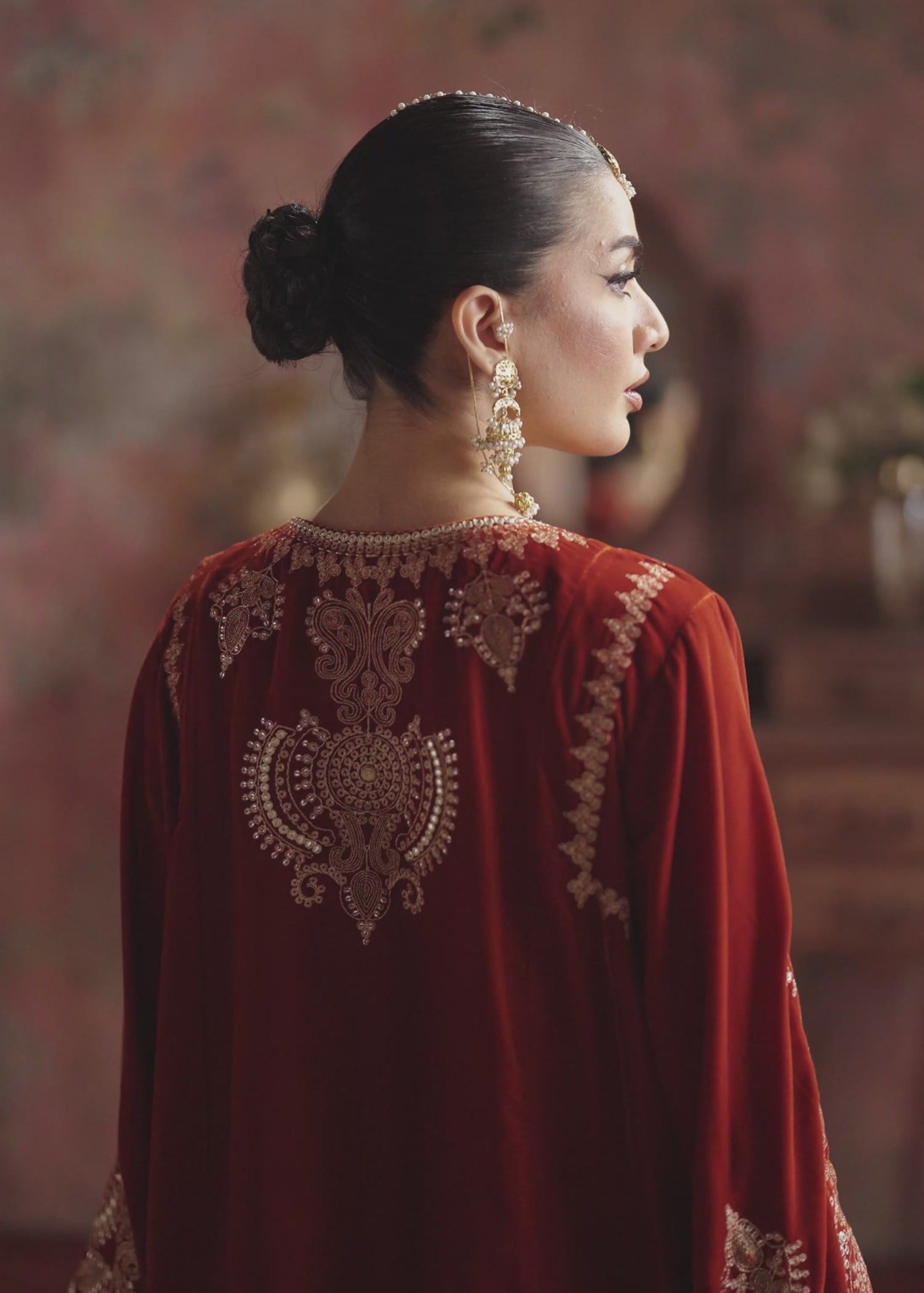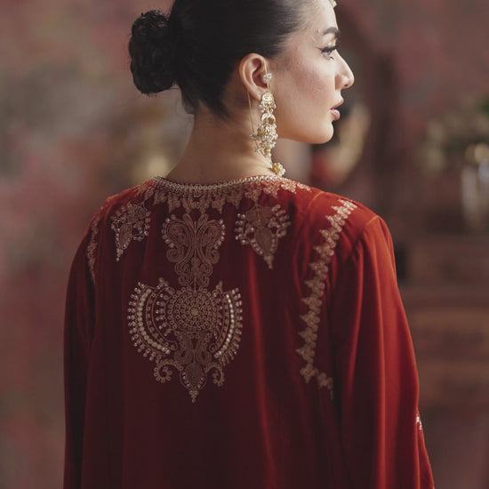 A tribute to Kashmiri artistry, this rust velvet pheran-style shirt is richly adorned with intricate tilla embroidery. The loose-fit silhouette flows with effortless grace, paired with sleek straight-cut trousers for a balanced elegance. Sequins and fine tilla thread embellishments illuminate the sleeves, neckline, front, and back, creating a masterpiece that resonates with heritage and couture refinement.