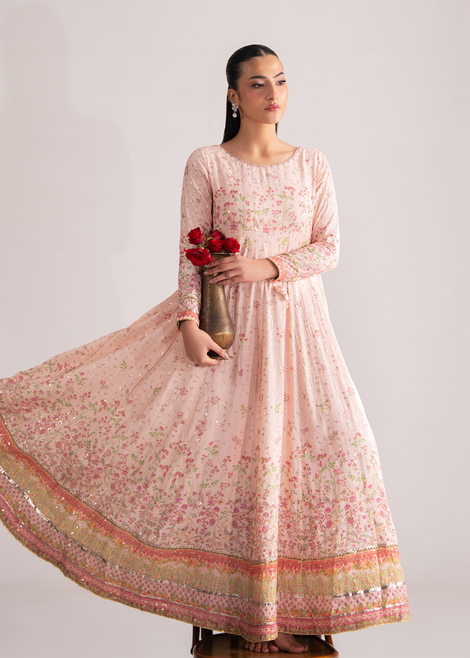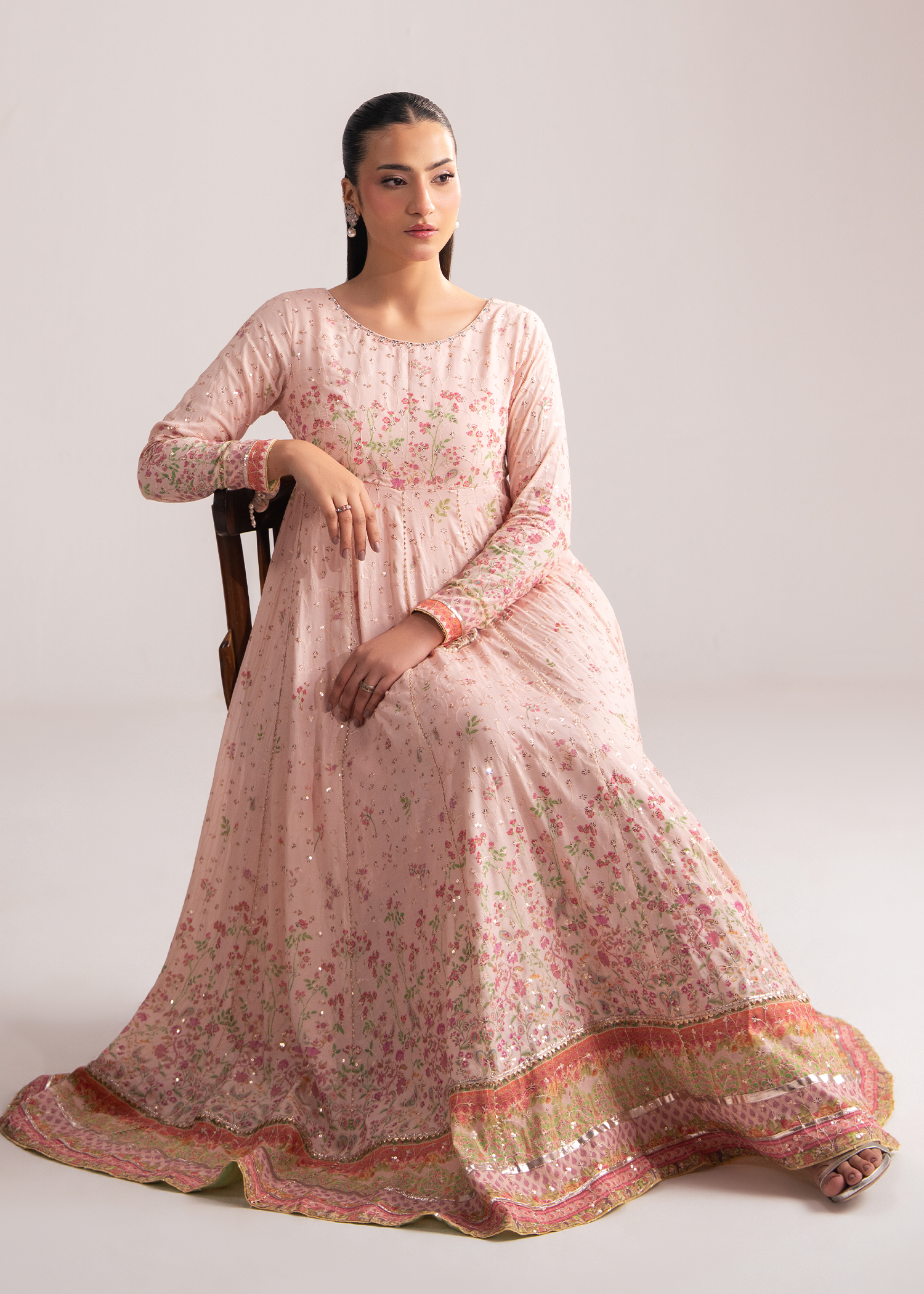 An elegant raw silk printed long frock, designed with a beautifully crafted statement neckline. Delicate pink floral prints unfold across the luxurious raw silk base, complemented by refined lace accents and subtle sequin detailing that adds a graceful shimmer. The opulent neckline is exquisitely finished with sequins and stylish tassels, adorned with intricate 3D flower and butterfly motifs enriched with pearl embellishments—capturing timeless luxury with artistic finesse.