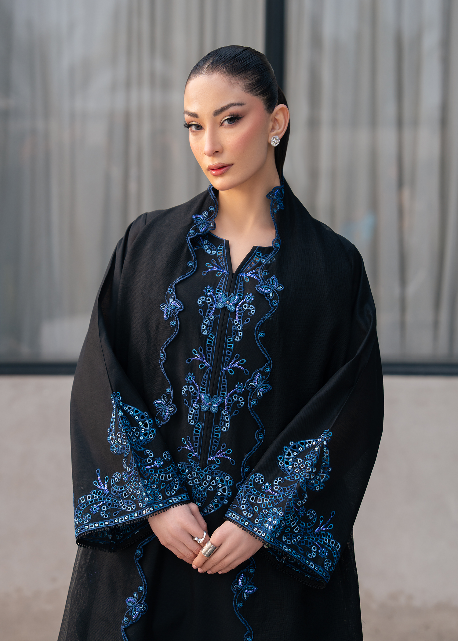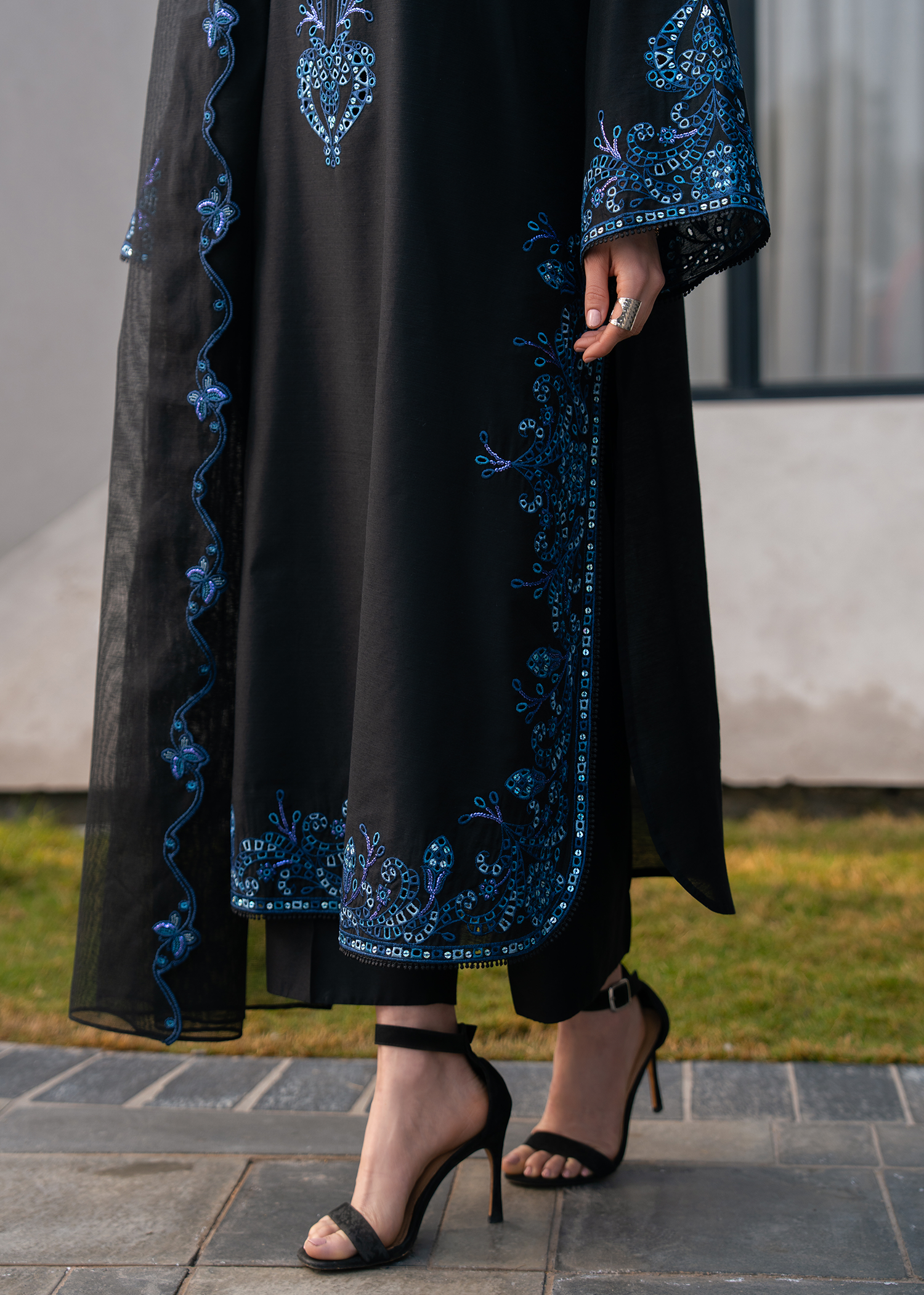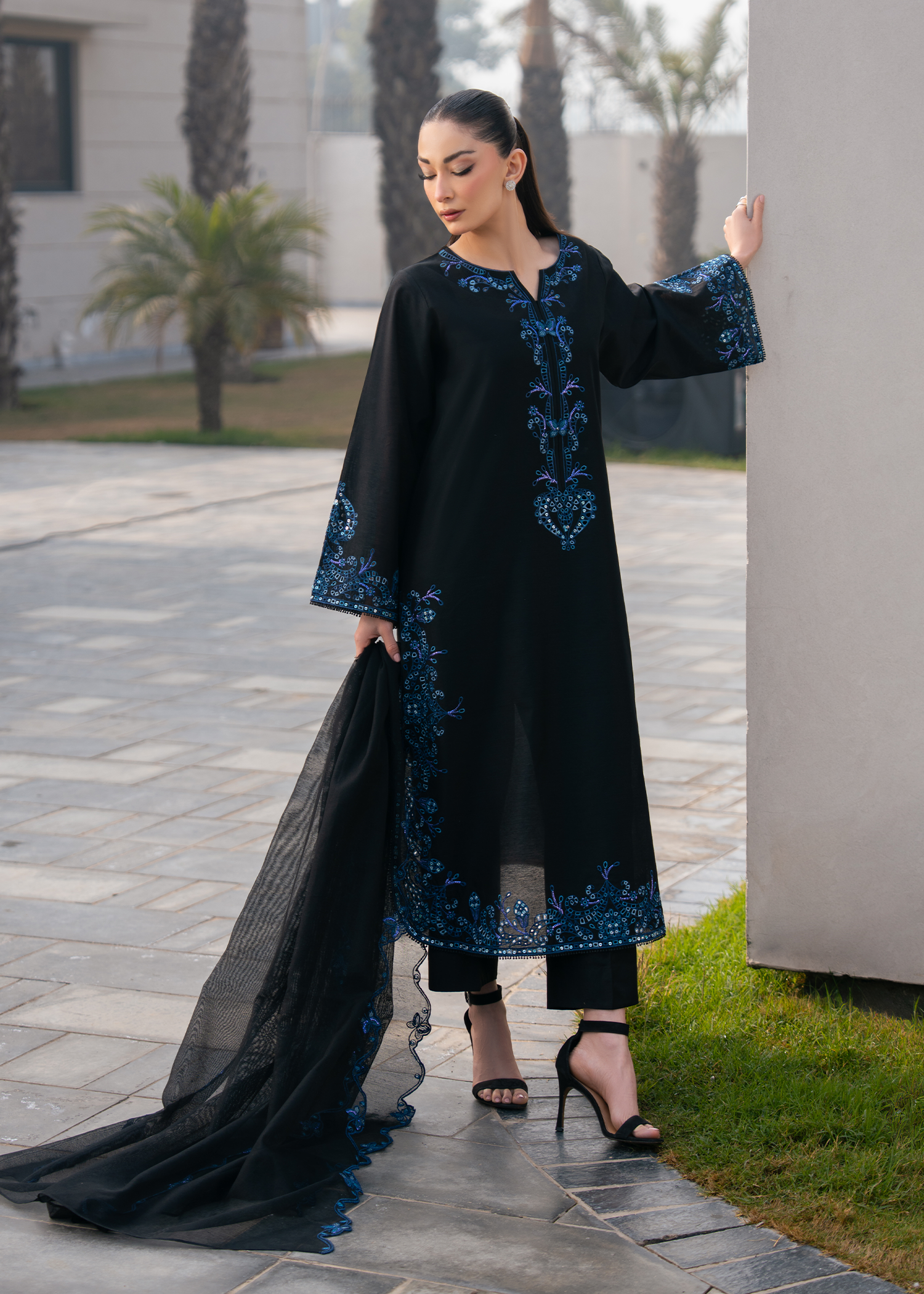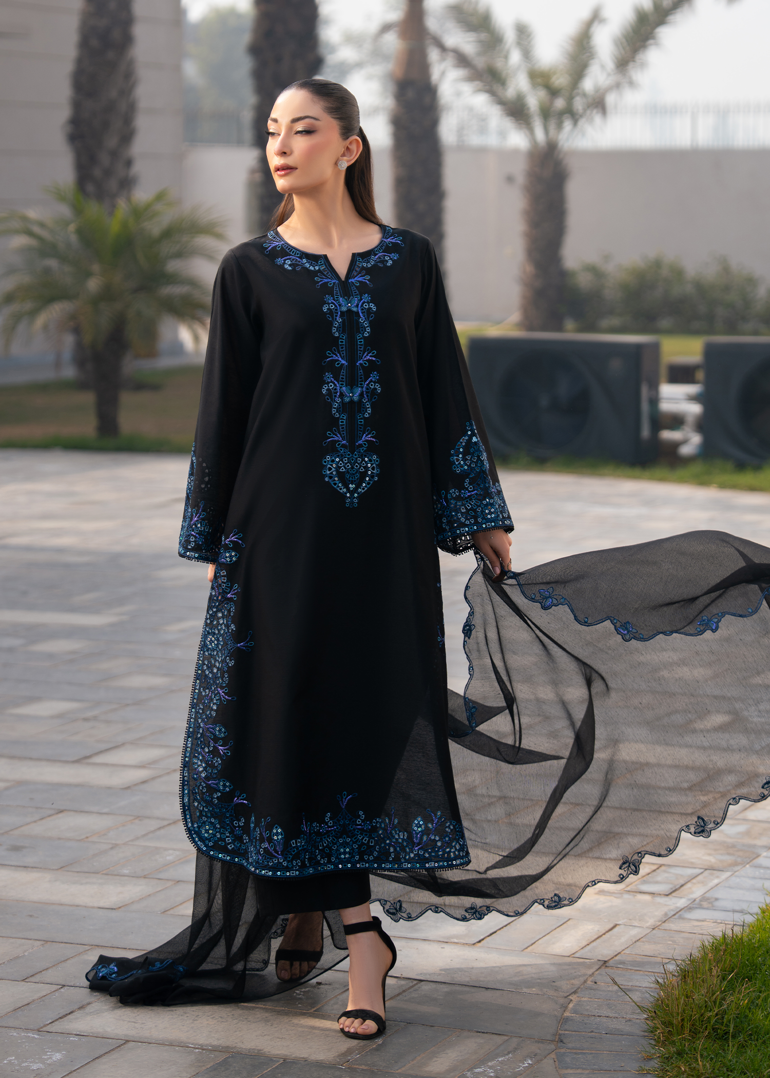 Make a statement in timeless elegance with this black embroidered ensemble, designed for refined sophistication. The outfit features intricate three-colour embroidery with delicate boring work, creating a luxurious textured finish. Heavy embroidered sleeves and a gracefully rounded hem enhance the classic silhouette, while a fully Chikankari-embroidered neckline adds traditional charm.