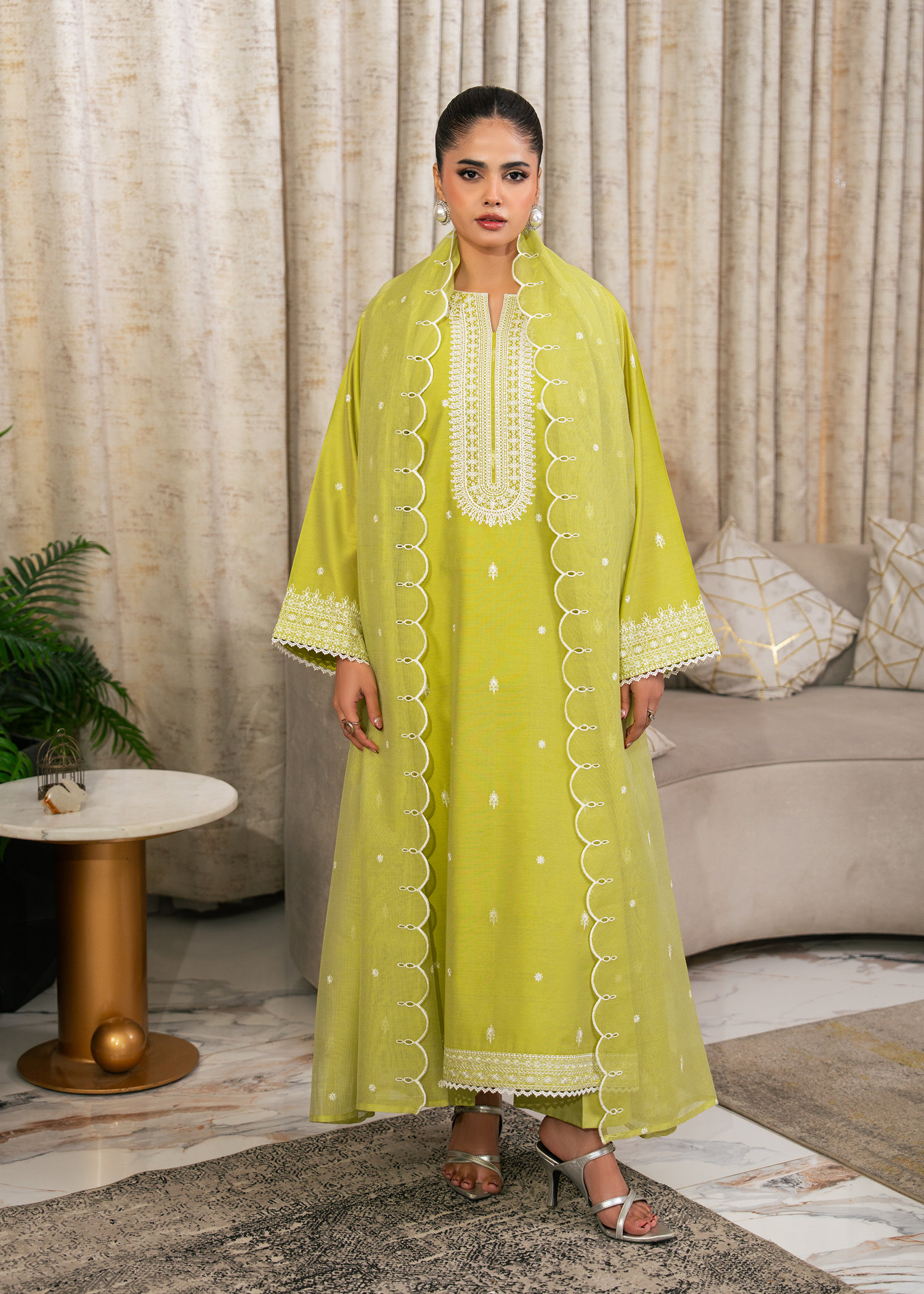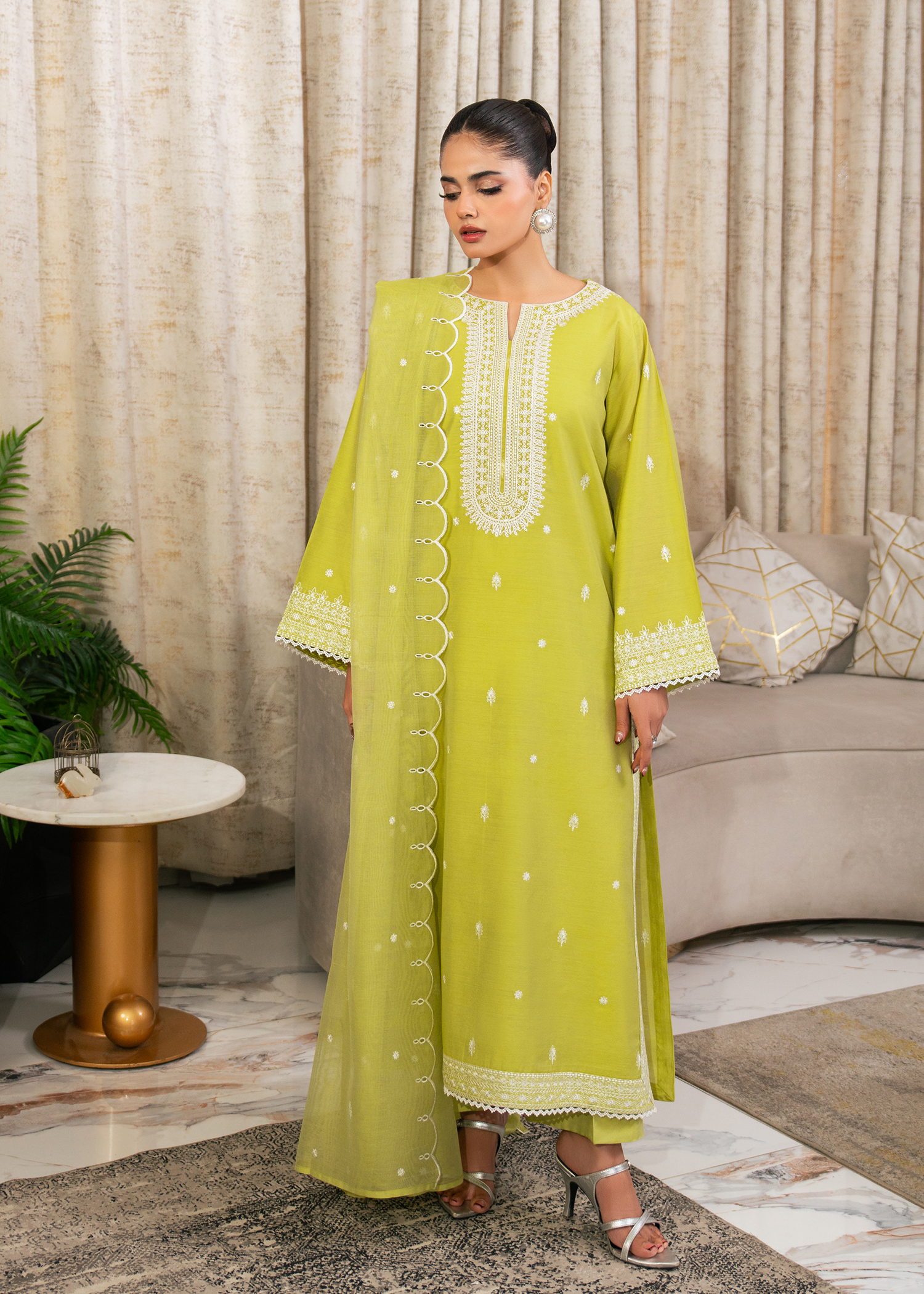 This refined 3-piece luxury suit is crafted to embody effortless elegance and timeless style. The straight-cut shirt features a graceful V-neckline, enhanced with intricate embroidery on the neckline and sleeves. Delicate lace detailing adorns the sleeves, chowk, borders, and hem, adding a soft yet sophisticated touch.
