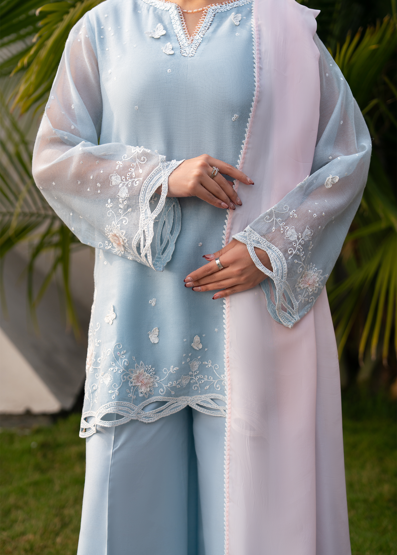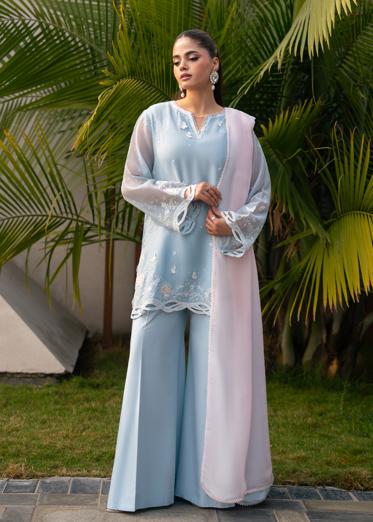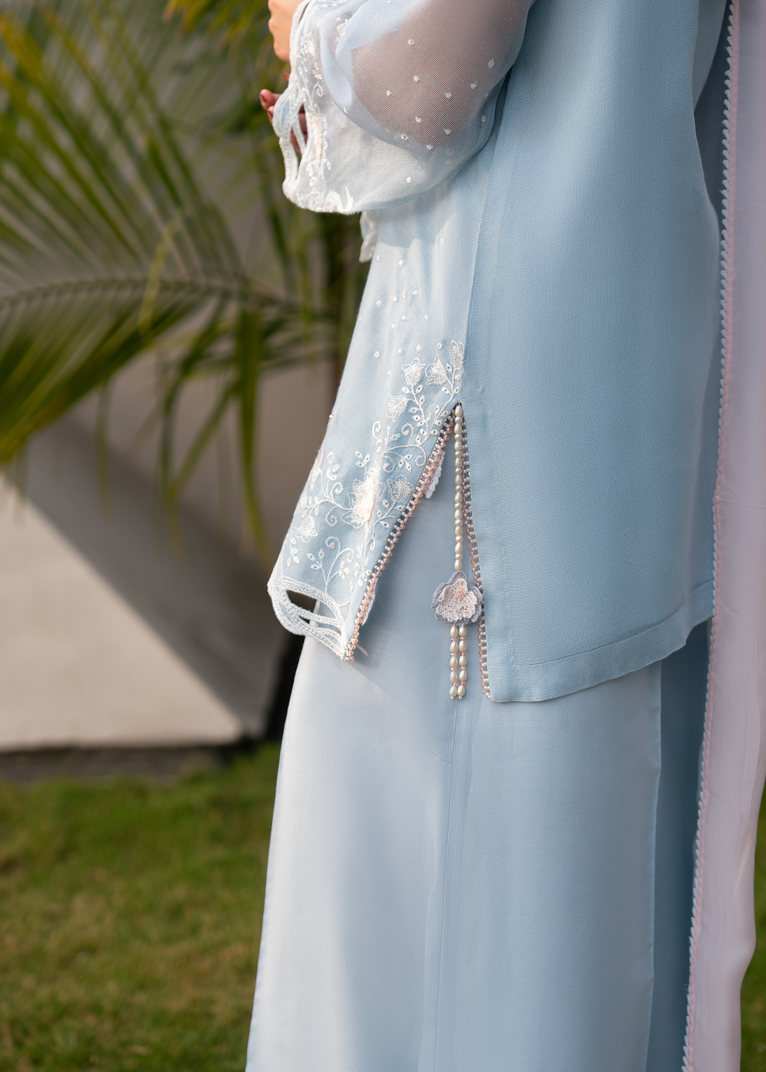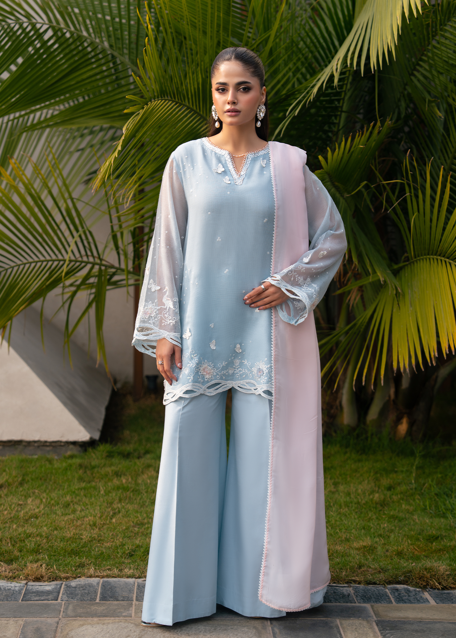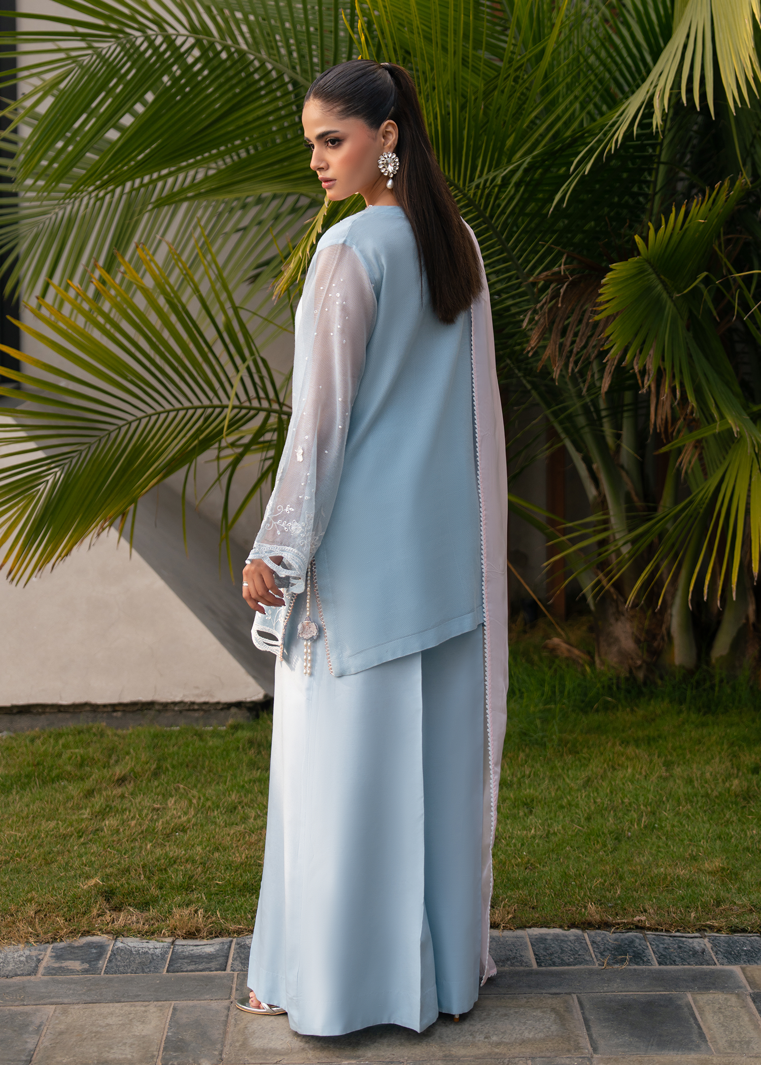 Intricate crystal detailing on the sleeves and hem enhances the elegance of the piece, catching the light with every movement. The look is completed with a medium silk dupatta, artfully designed in soft half blush pink and half icy blue, finished with lace detailing along all four edges. Wide-leg palazzo pants in a matching powder blue shade balance the ensemble with modern sophistication, while the attached lining ensures comfort and ease.