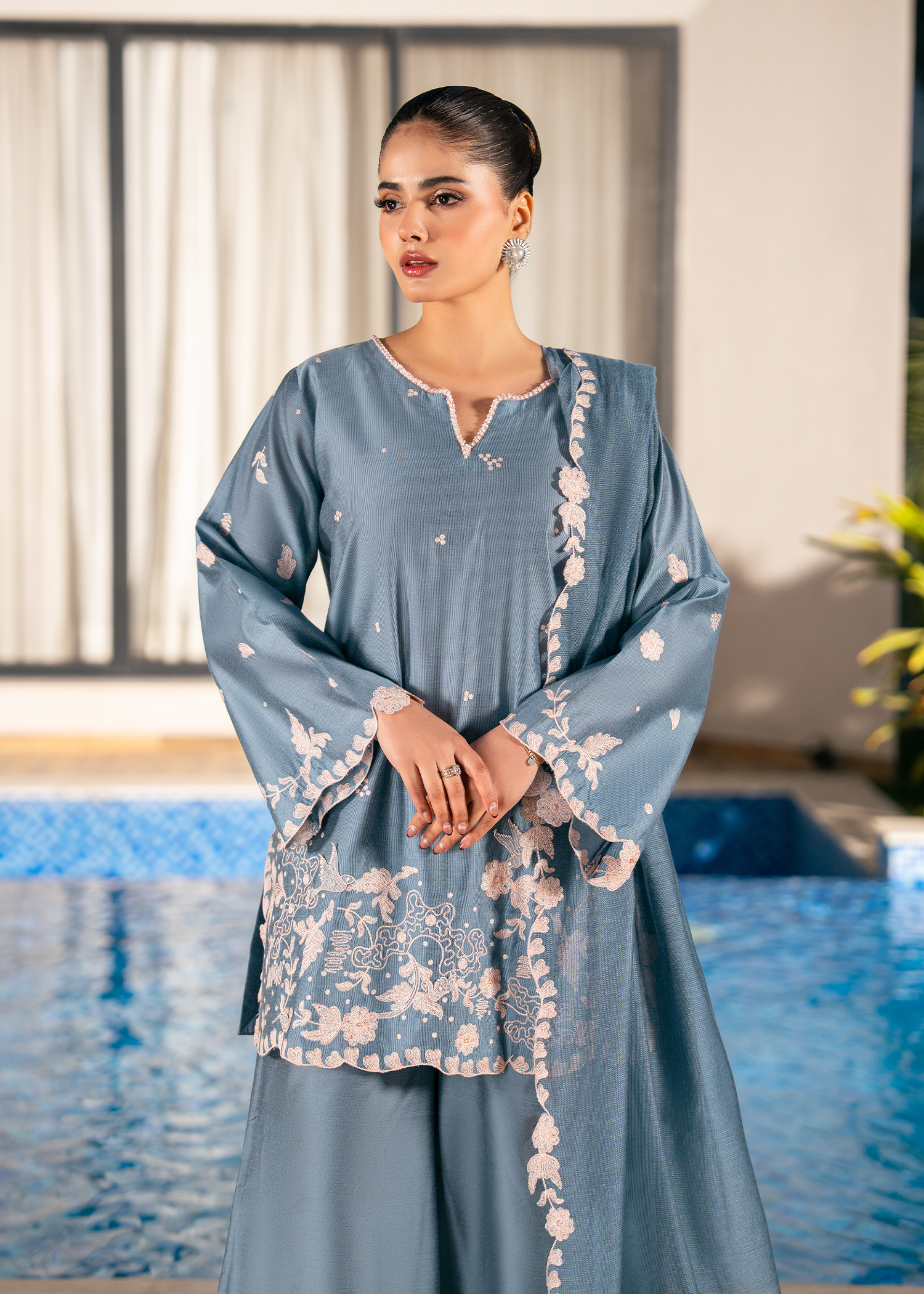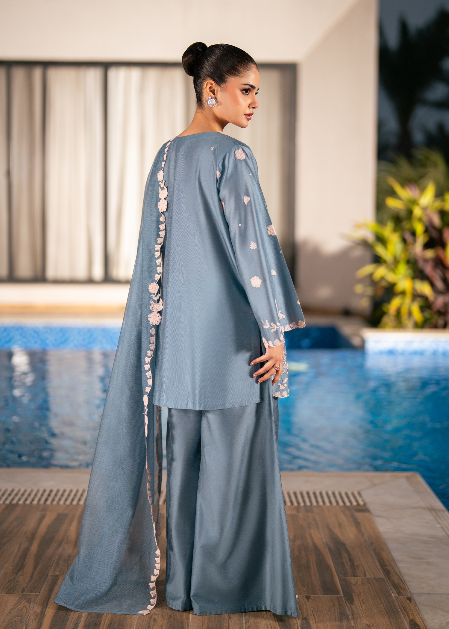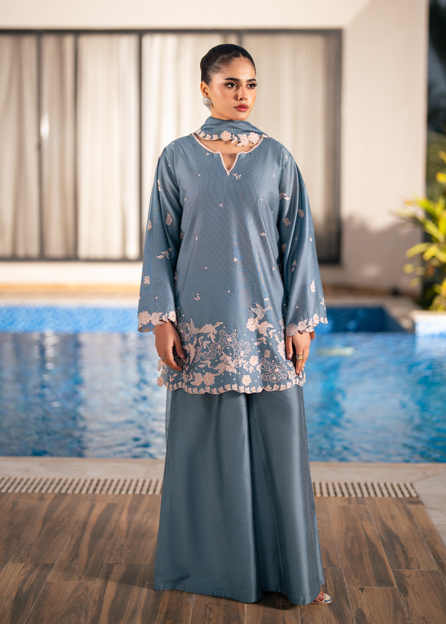Bring a playful yet sophisticated touch to your wardrobe with this modern slate grey embroidered ensemble. The design features shaded peach threadwork with delicate handmade embroidery, adding subtle texture and refined artistry.