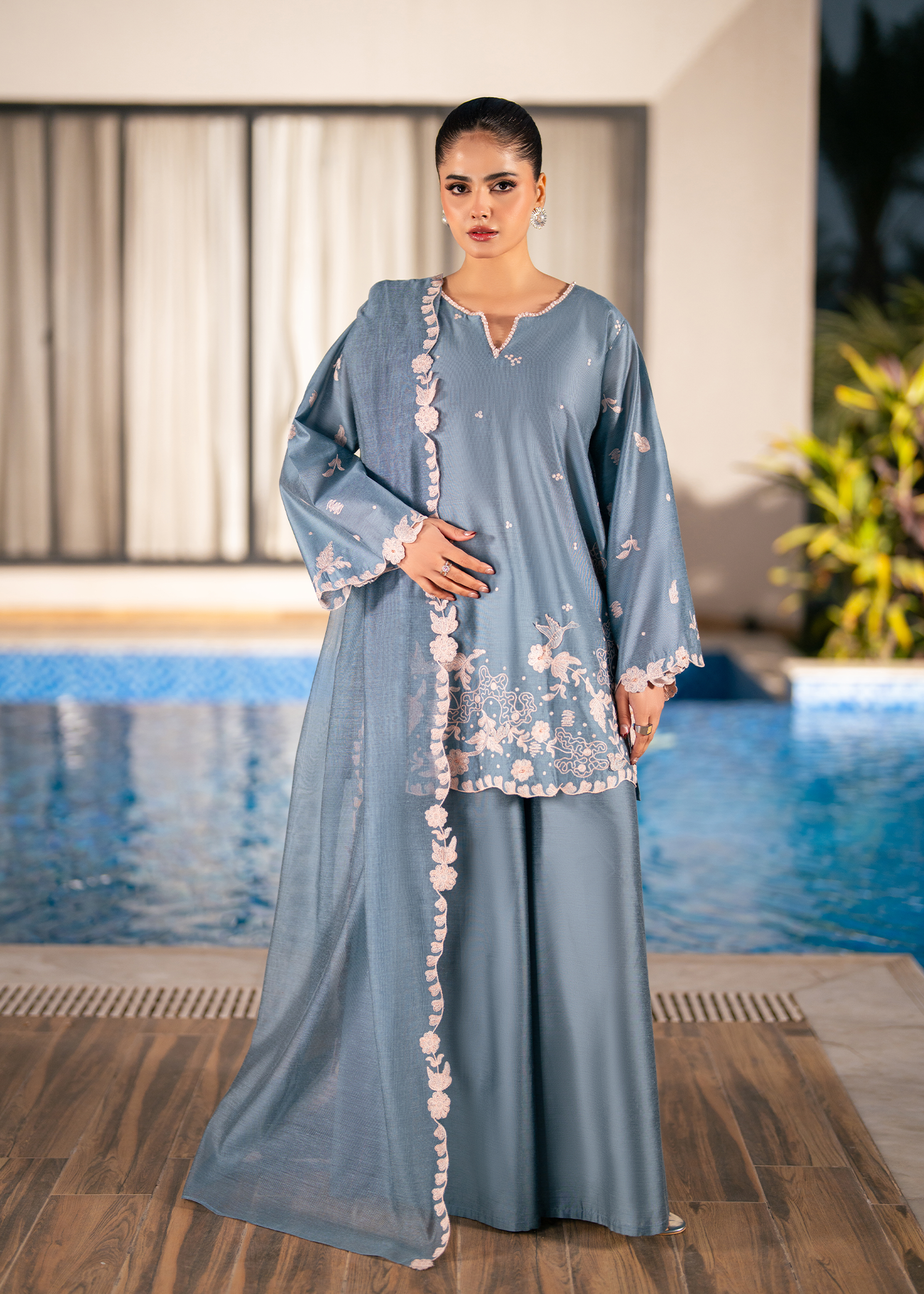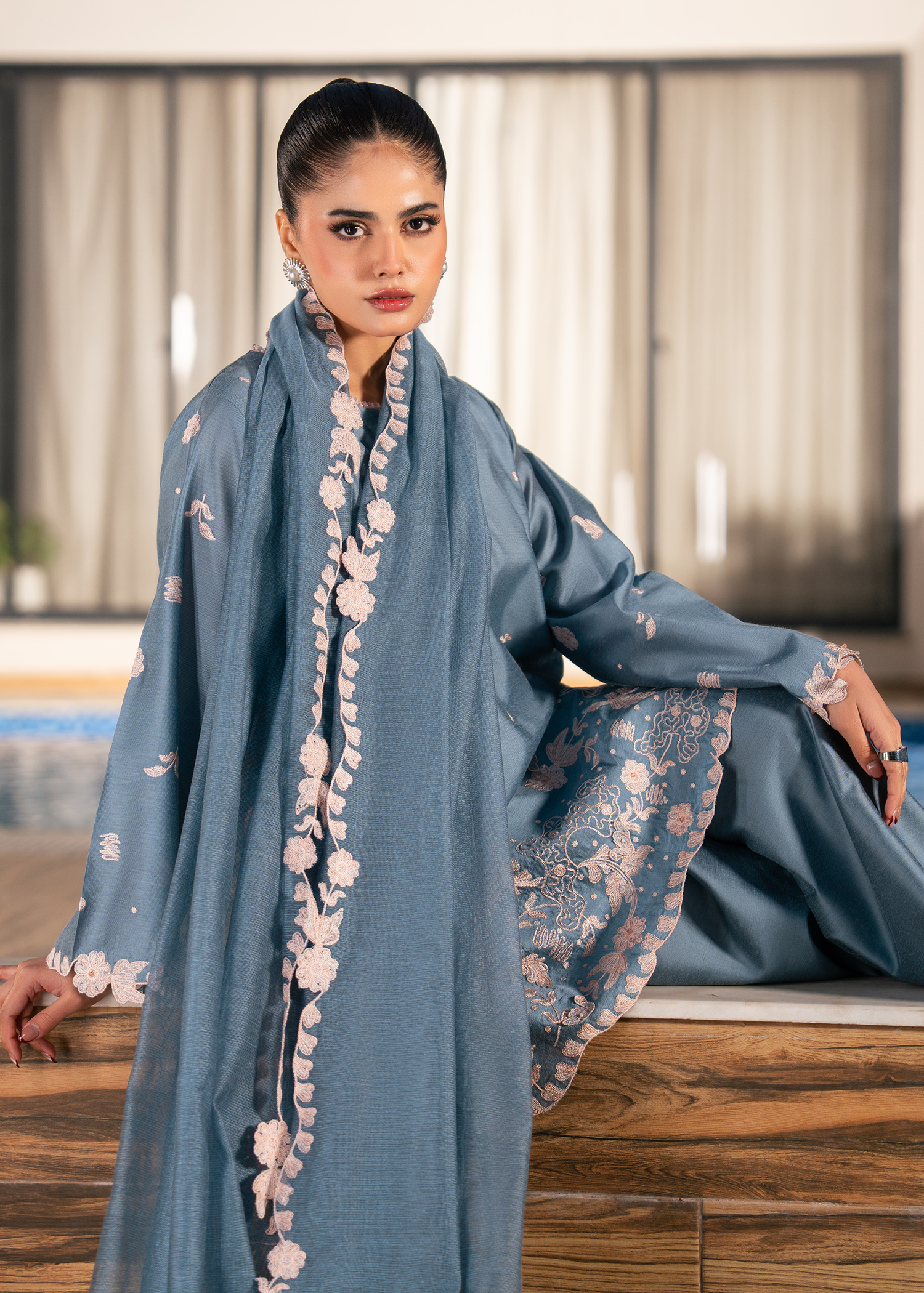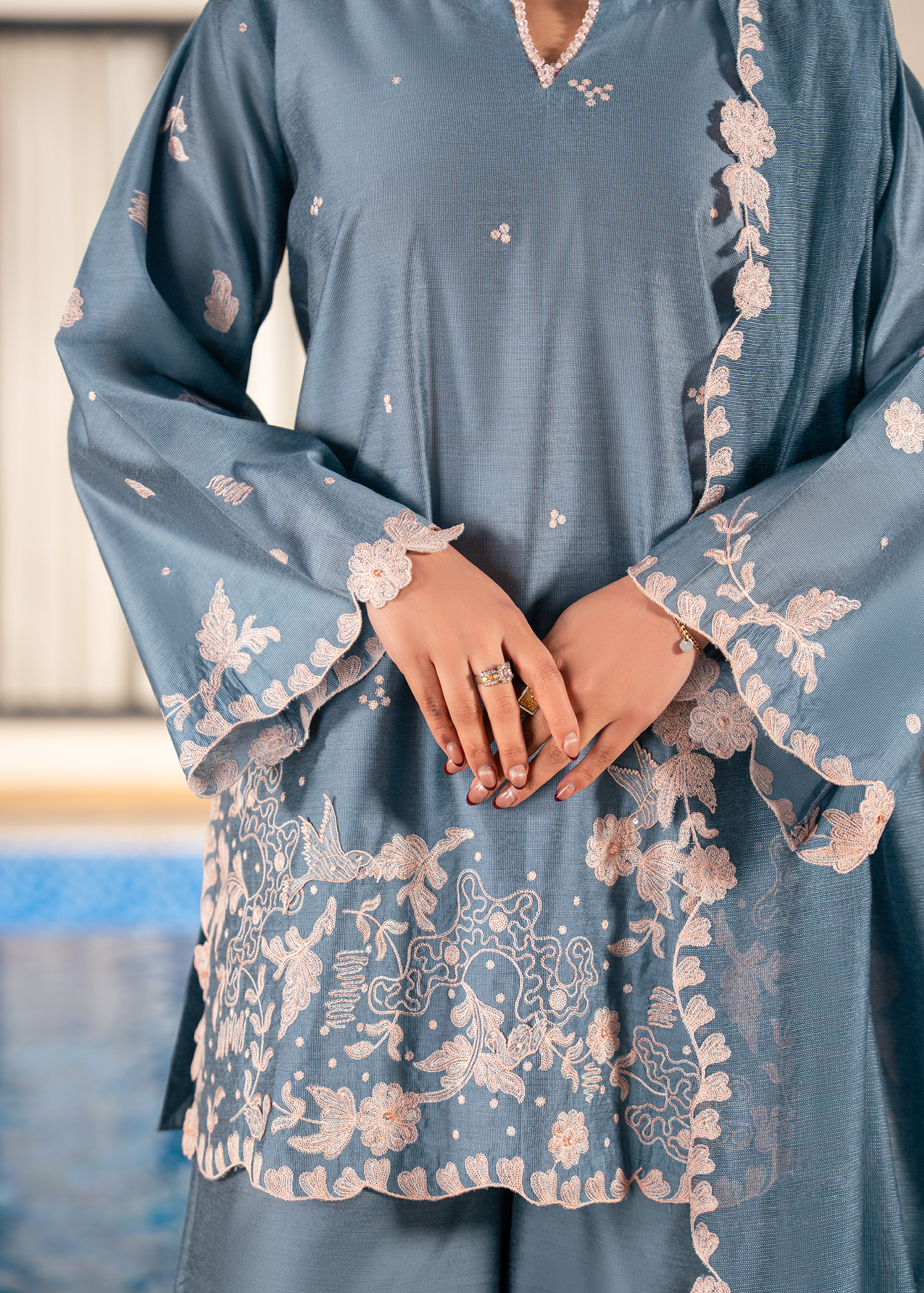 Bring a playful yet sophisticated touch to your wardrobe with this modern slate grey embroidered ensemble. The design features shaded peach threadwork with delicate handmade embroidery, adding subtle texture and refined artistry.