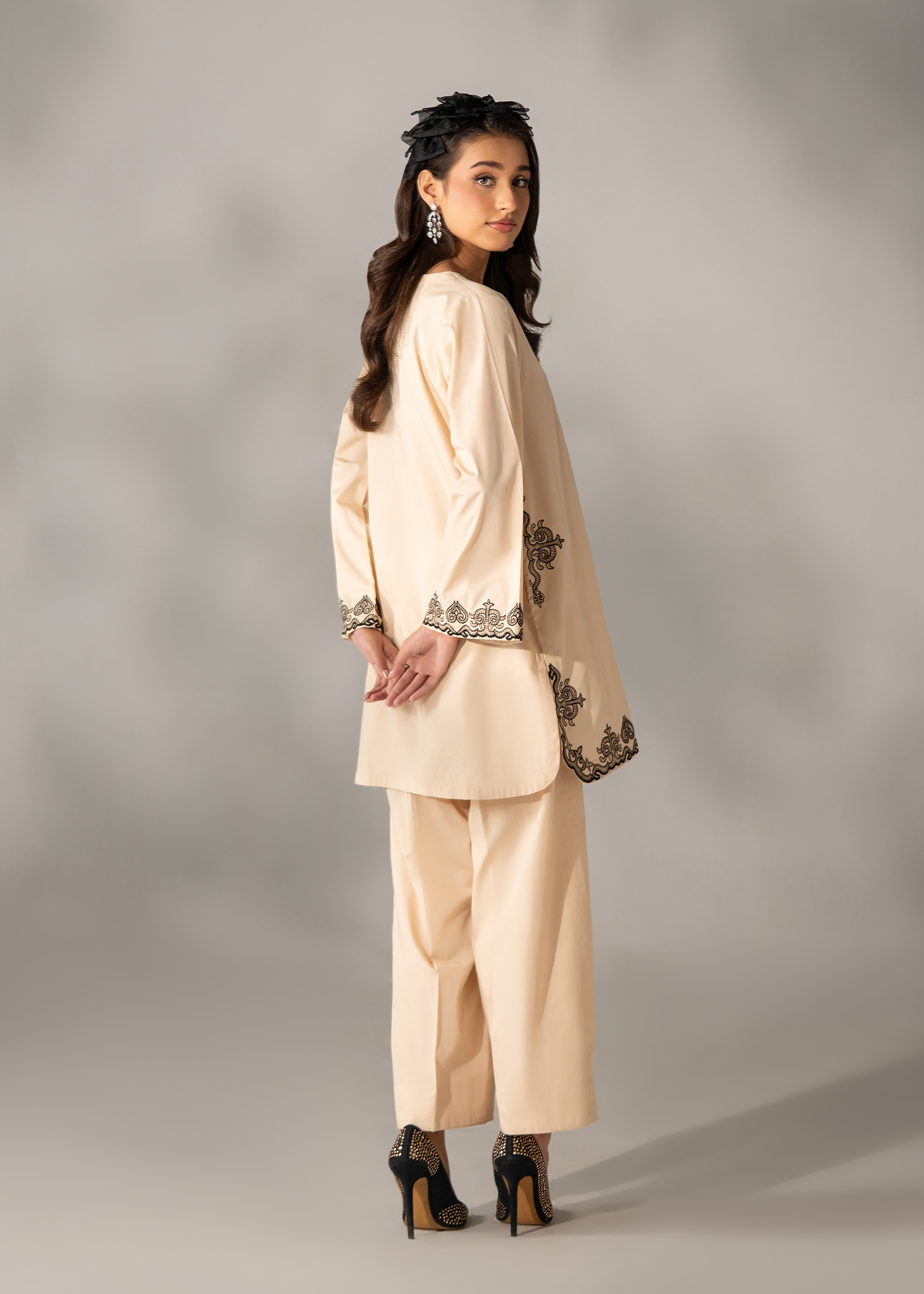 A modern co-ord set with applique style embroidery on the neckline, sleeves, hem, and pockets, finished with understated black tassels at the neckline. Simple, refined, and designed for comfortable everyday wear.