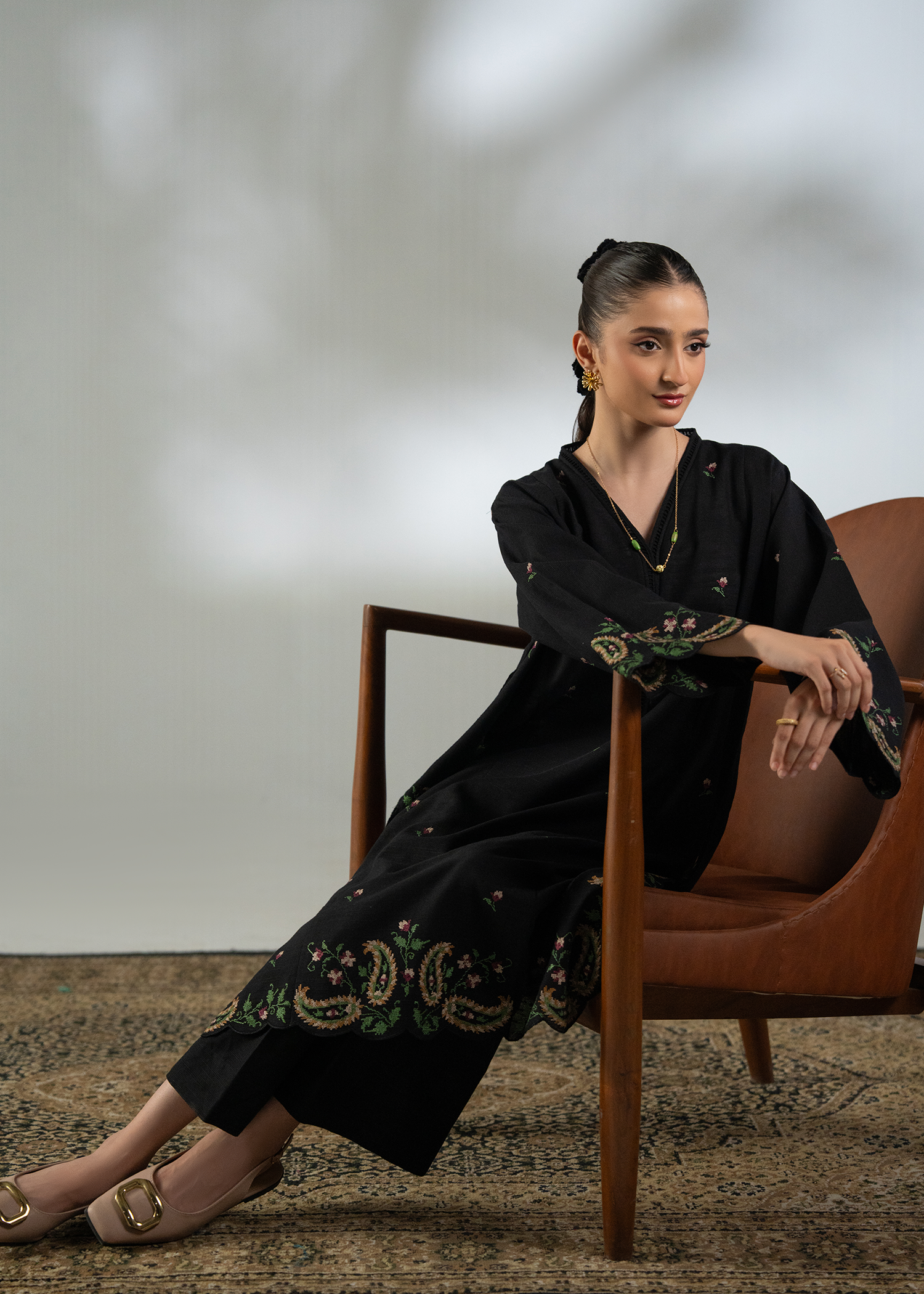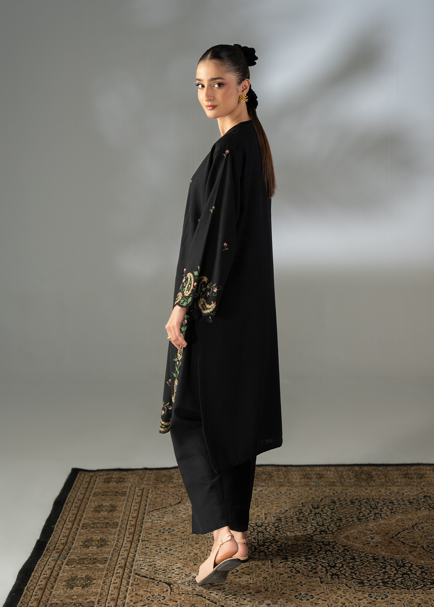 This elegant ensemble features a long shirt adorned with multicolor embroidery on the hem and sleeves, intricately designed in a stunning cross-stitch pattern. Paired with straight-cut trousers, the outfit perfectly blends tradition and contemporary style for the winter season.