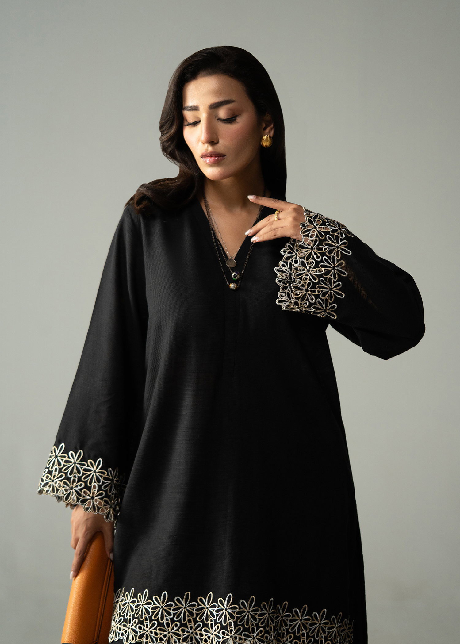 This classic black khaddar suit is elevated with intricate boring embroidery and shaded threadwork on the hem, sleeves, and trousers, adding depth and elegance to the design. The short shirt paired with straight-cut trousers creates a refined silhouette, making it a versatile choice for winters.