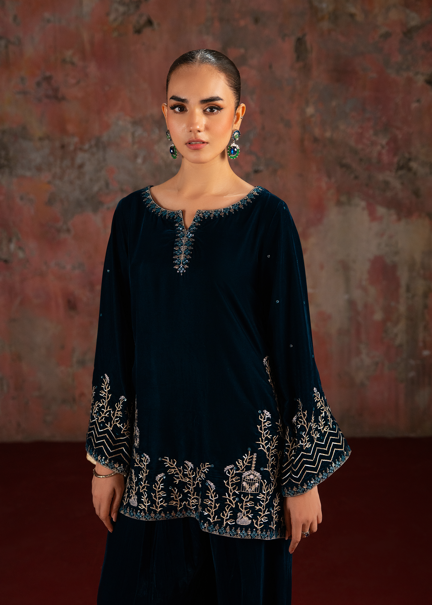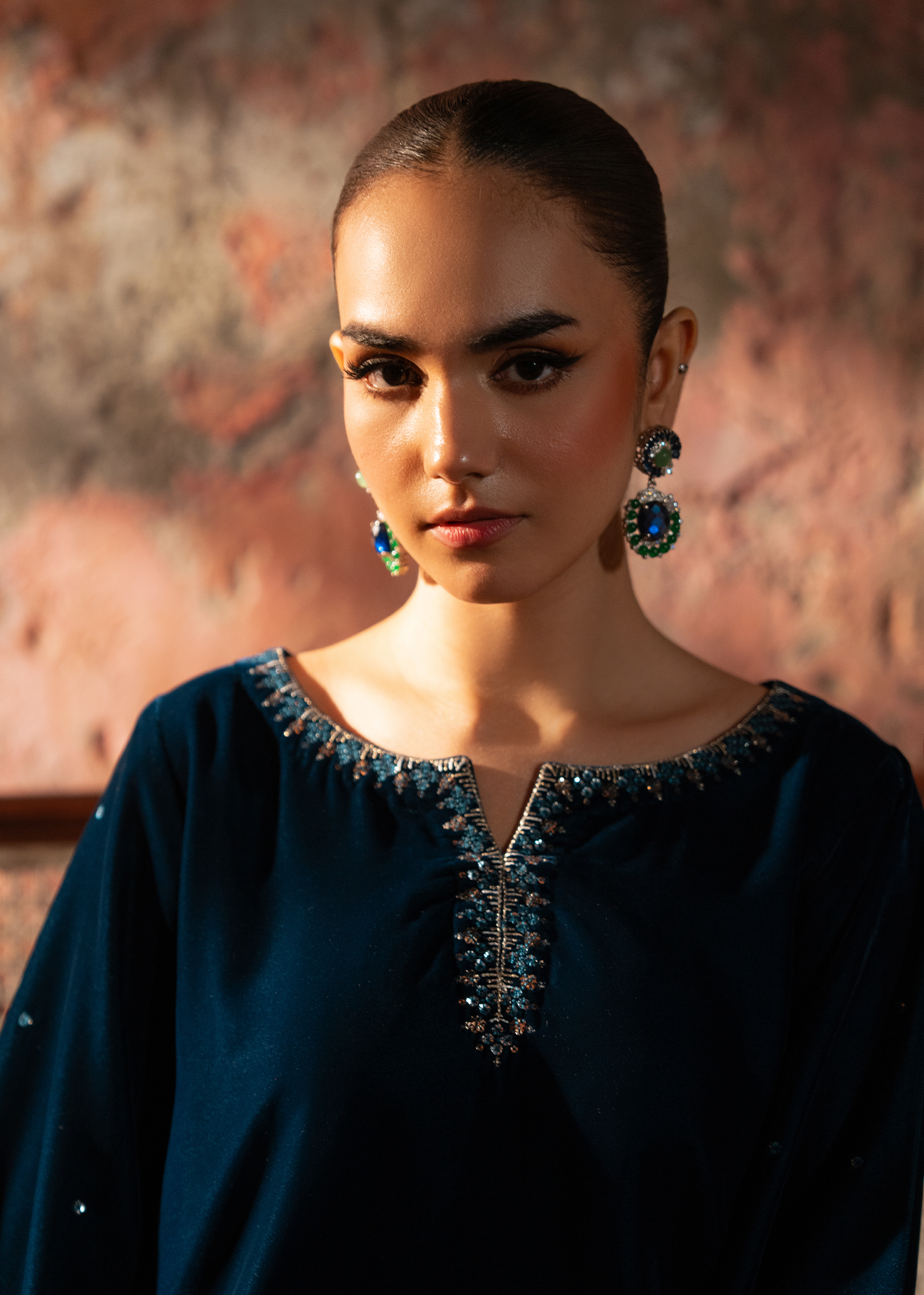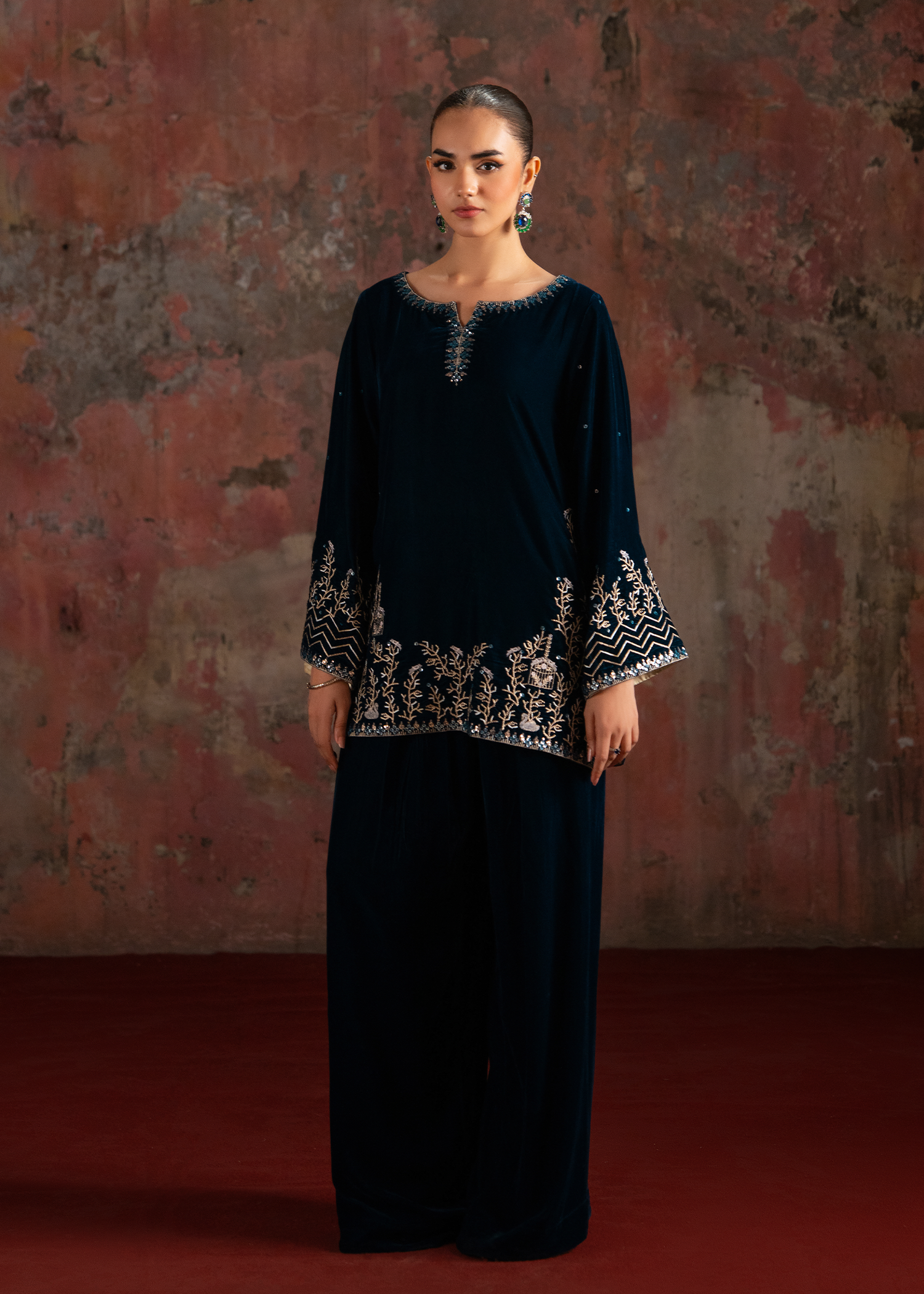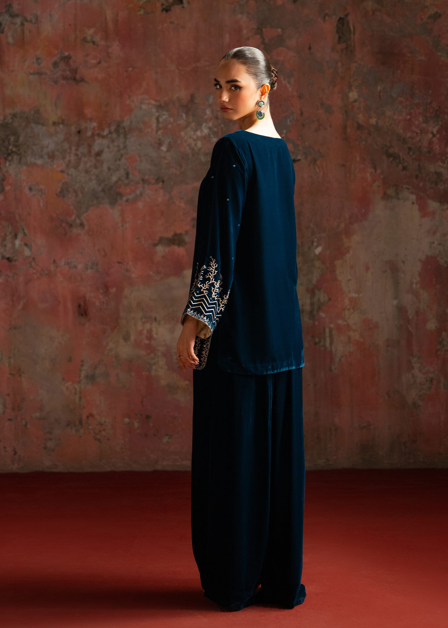 An indigo-dyed velvet suit that radiates modern opulence, intricately adorned with tilla, threadwork, and luminous sequin embellishment. The artistry lies in the interplay of two sequin sizes — 3mm and 5mm — creating layers of sparkle that dance with the light. A tailored short shirt pairs seamlessly with fluid flared trousers, balancing structure with movement.