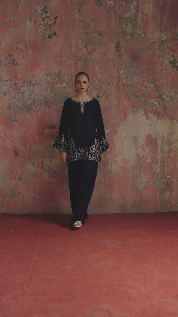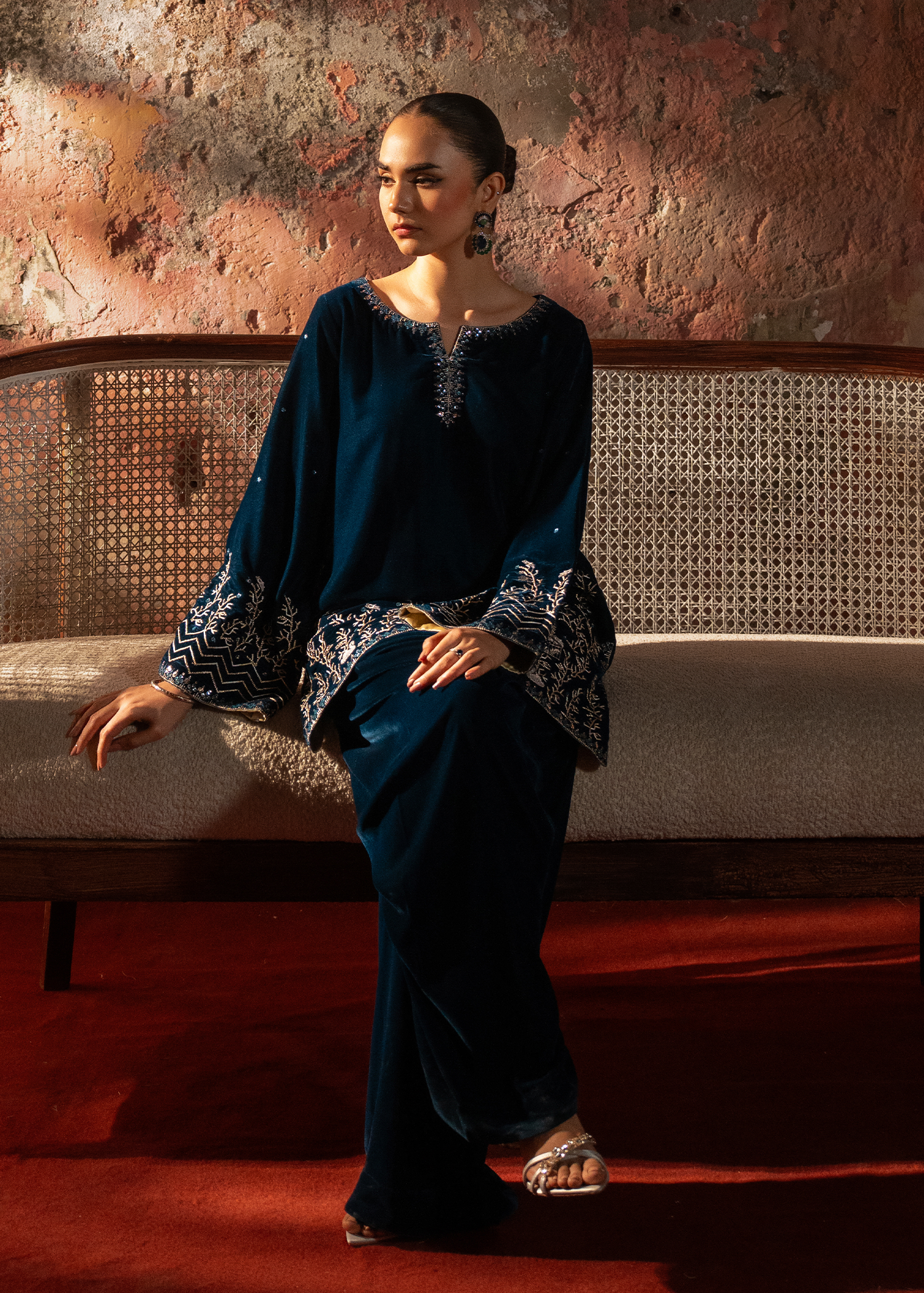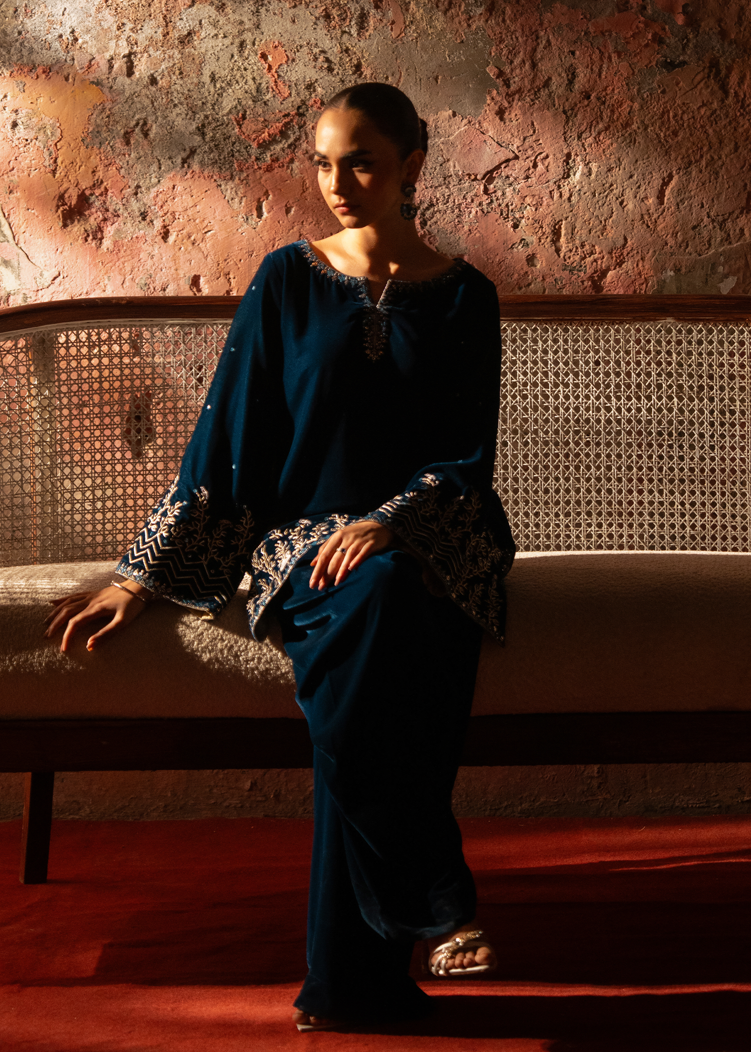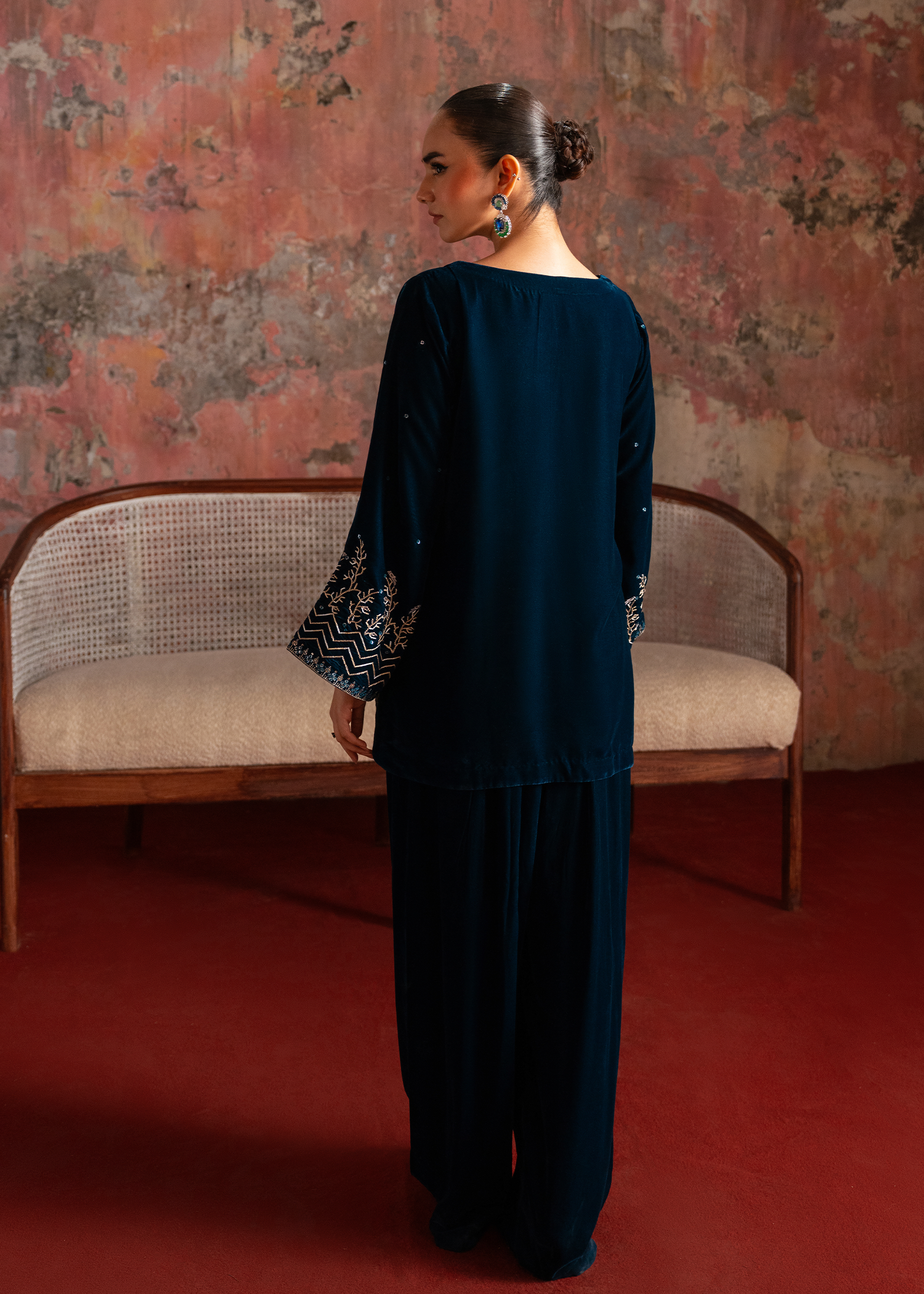 An indigo-dyed velvet suit that radiates modern opulence, intricately adorned with tilla, threadwork, and luminous sequin embellishment. The artistry lies in the interplay of two sequin sizes — 3mm and 5mm — creating layers of sparkle that dance with the light. A tailored short shirt pairs seamlessly with fluid flared trousers, balancing structure with movement.