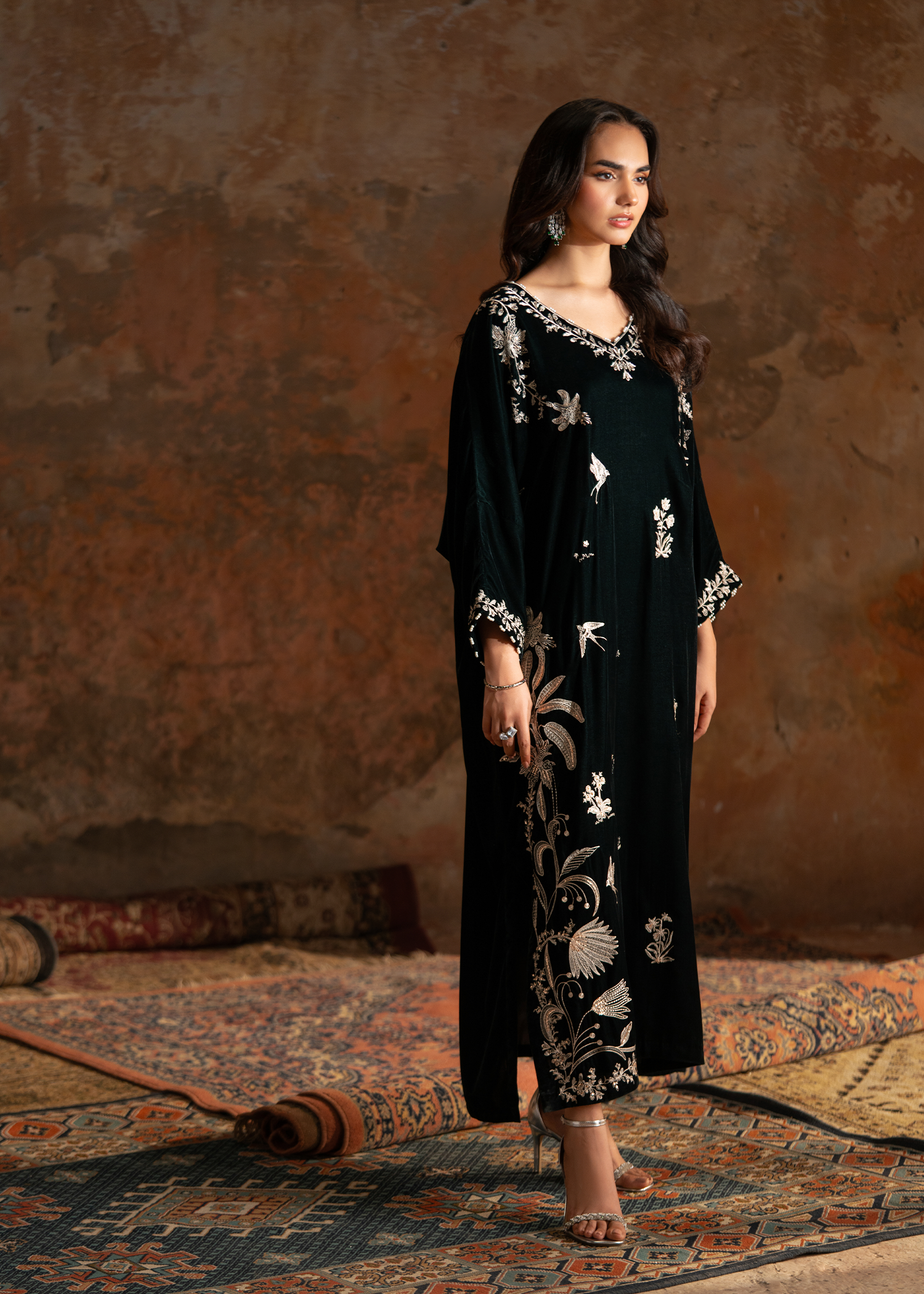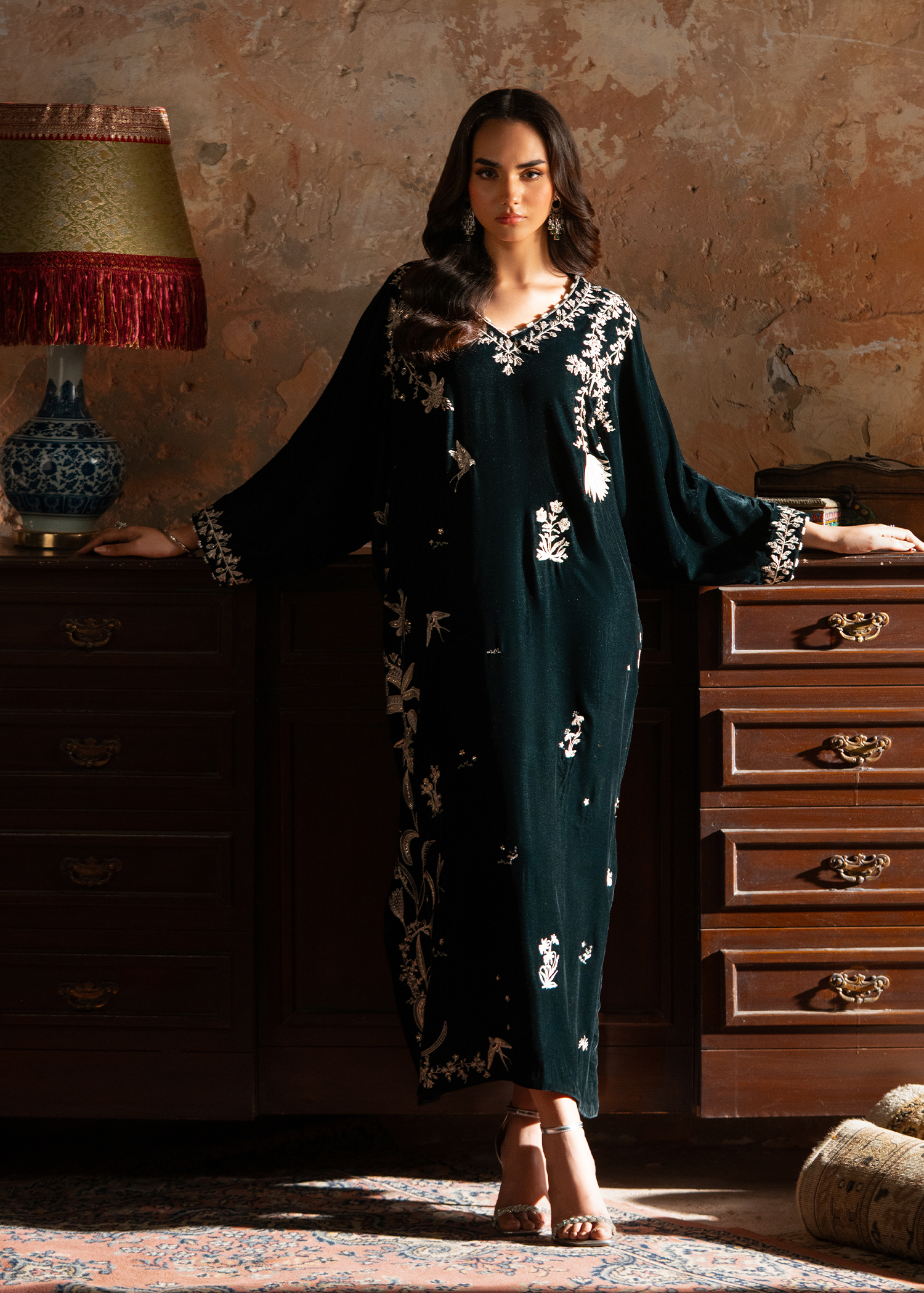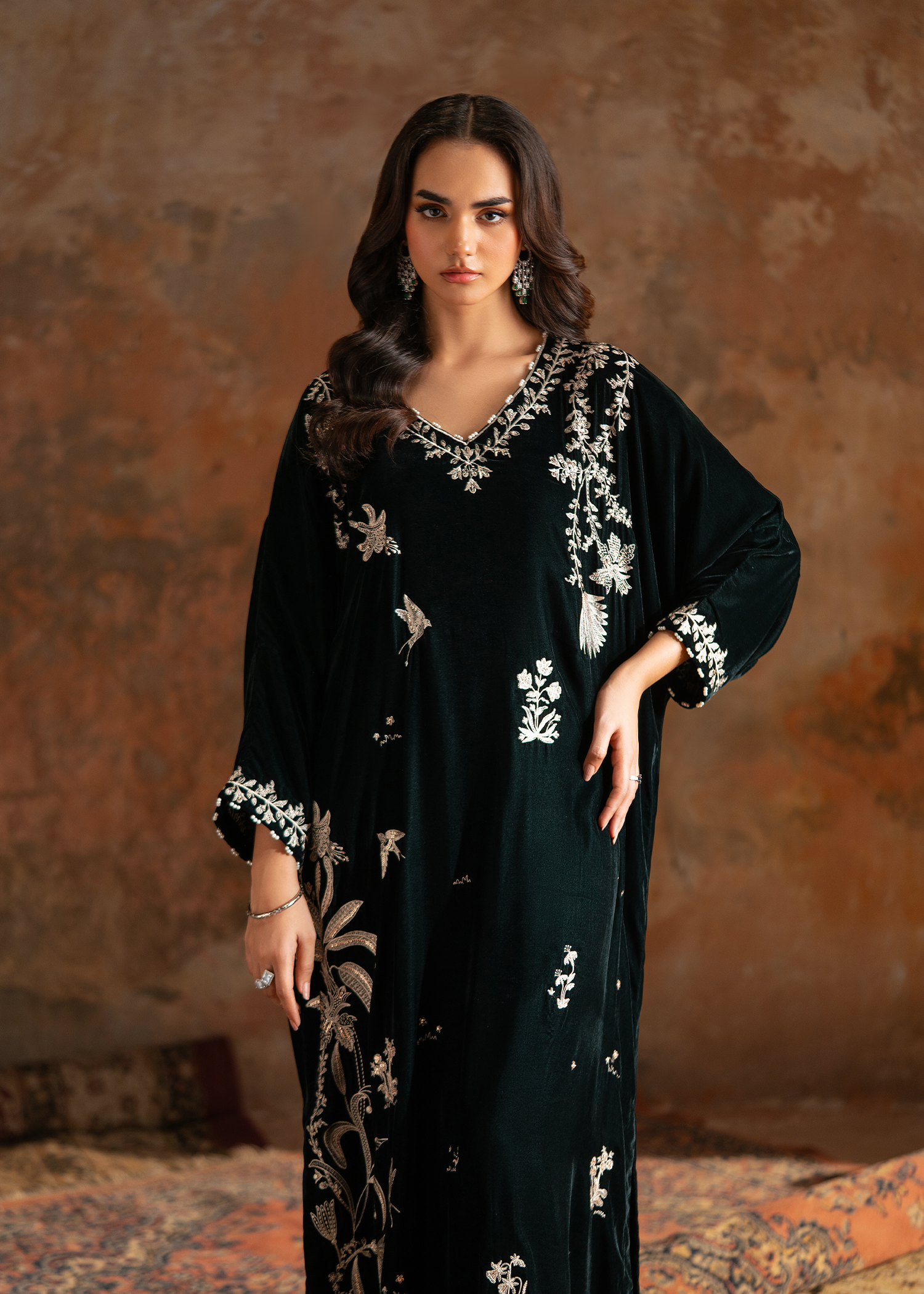 Make a statement in this elegant emerald green velvet kaftan. Crafted in a flowing silhouette, it features intricate embroidery, sequin work, and delicate pearl embellishments along the neckline and sleeves, adding a touch of regal charm. The rich green hue enhances the luxurious details, making it a stunning choice for festive occasions, evening soirees, or intimate celebrations.