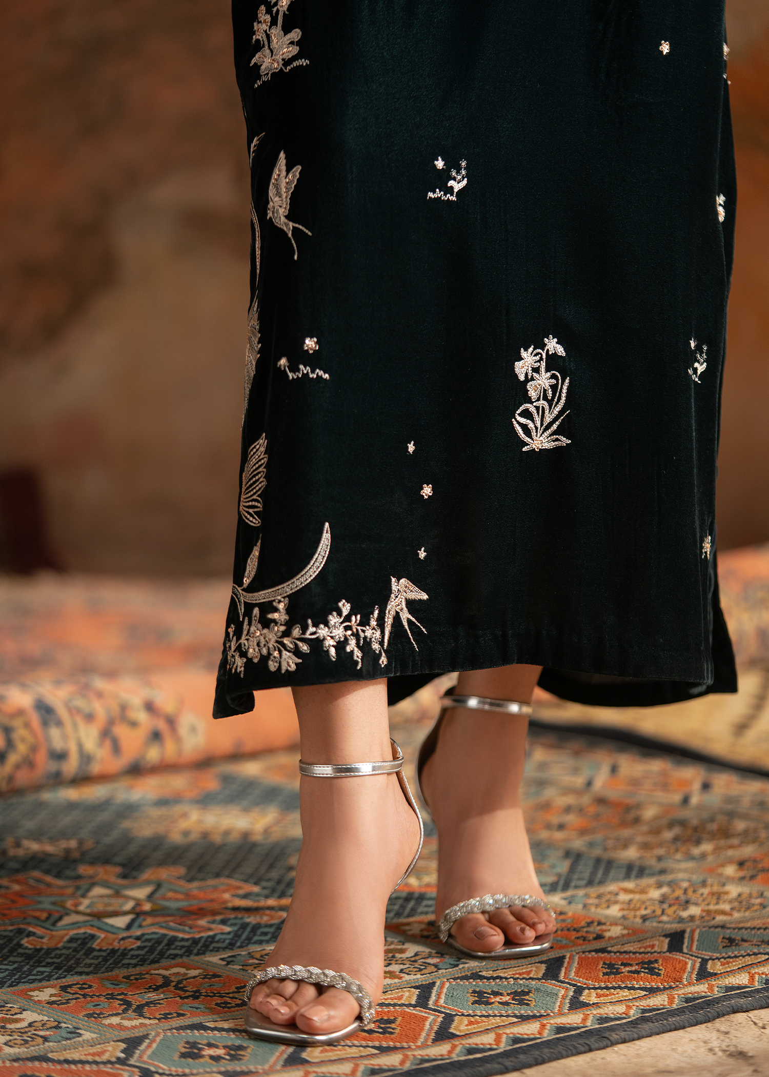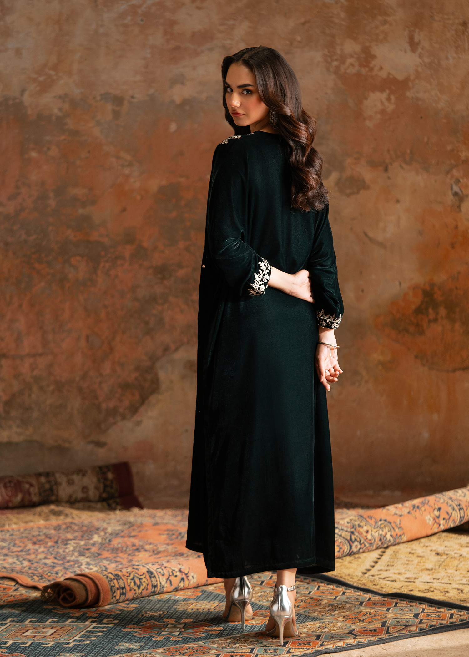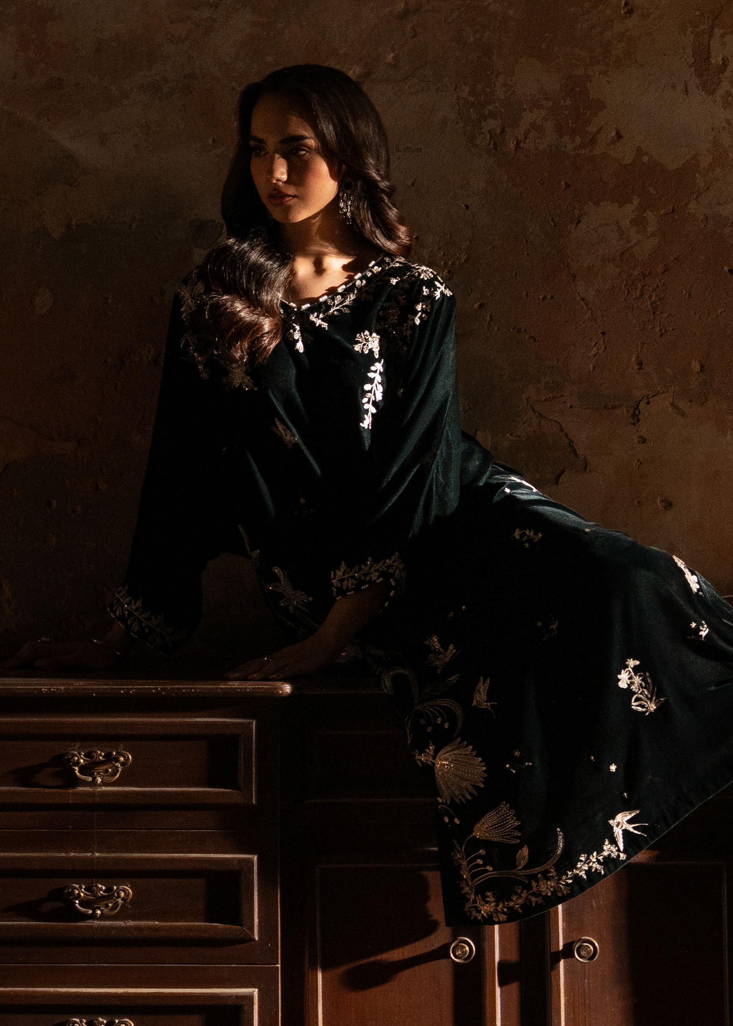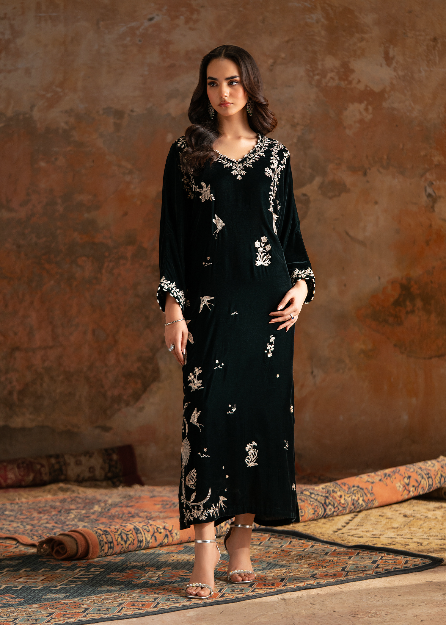Make a statement in this elegant emerald green velvet kaftan. Crafted in a flowing silhouette, it features intricate embroidery, sequin work, and delicate pearl embellishments along the neckline and sleeves, adding a touch of regal charm. The rich green hue enhances the luxurious details, making it a stunning choice for festive occasions, evening soirees, or intimate celebrations.