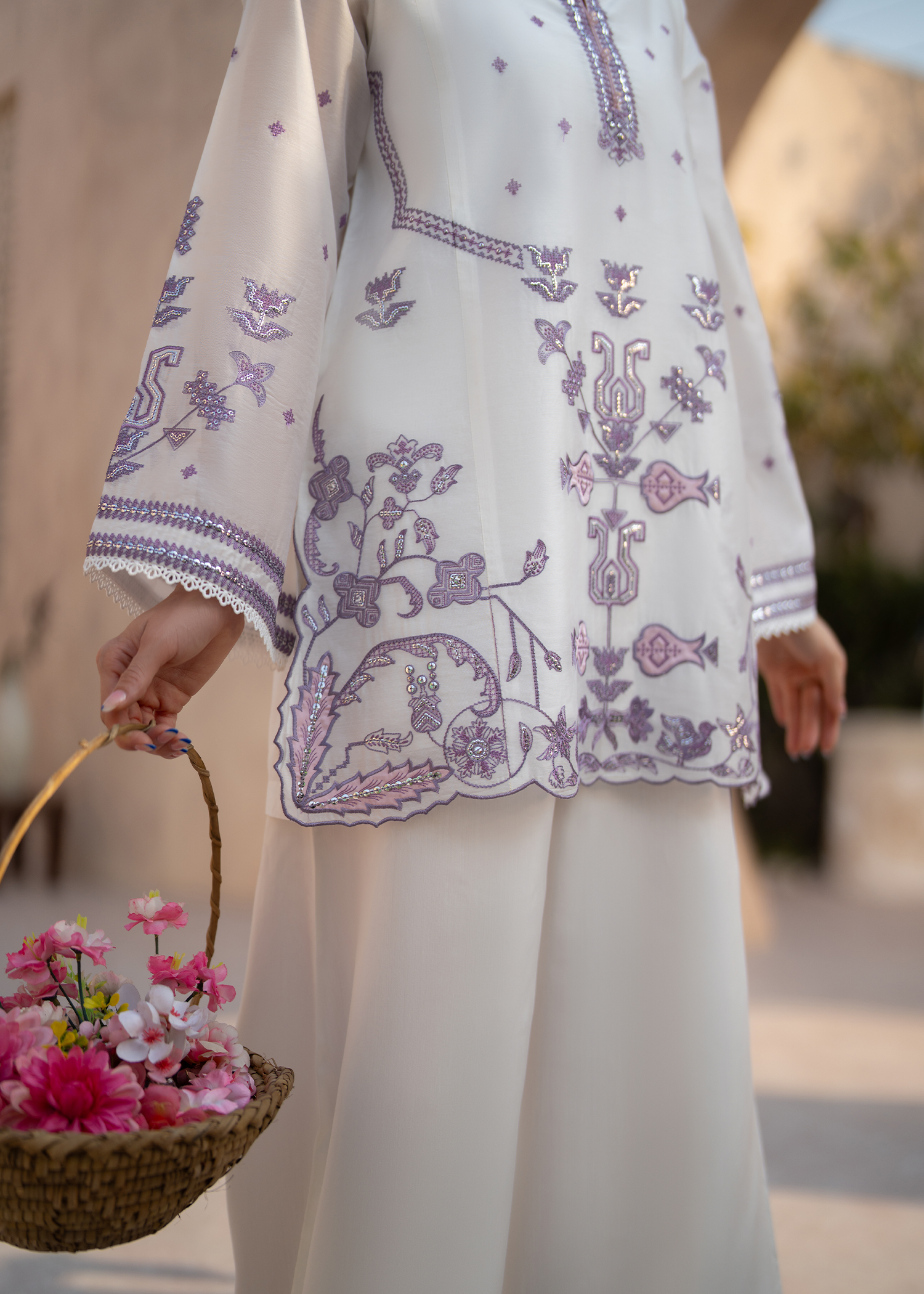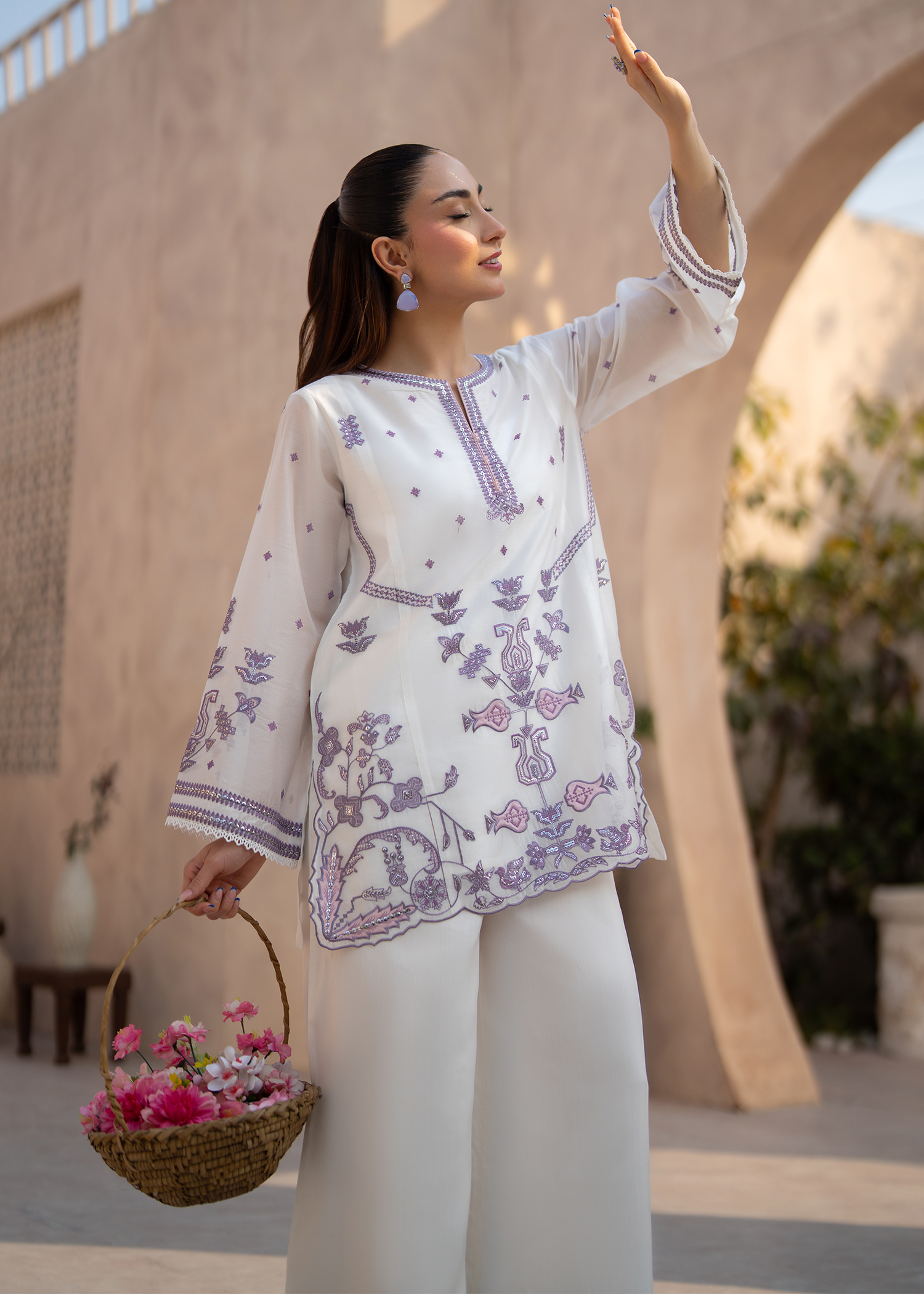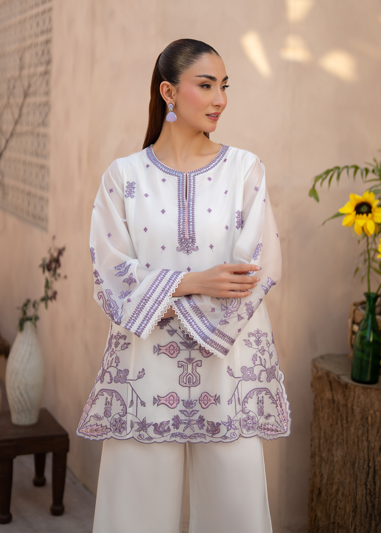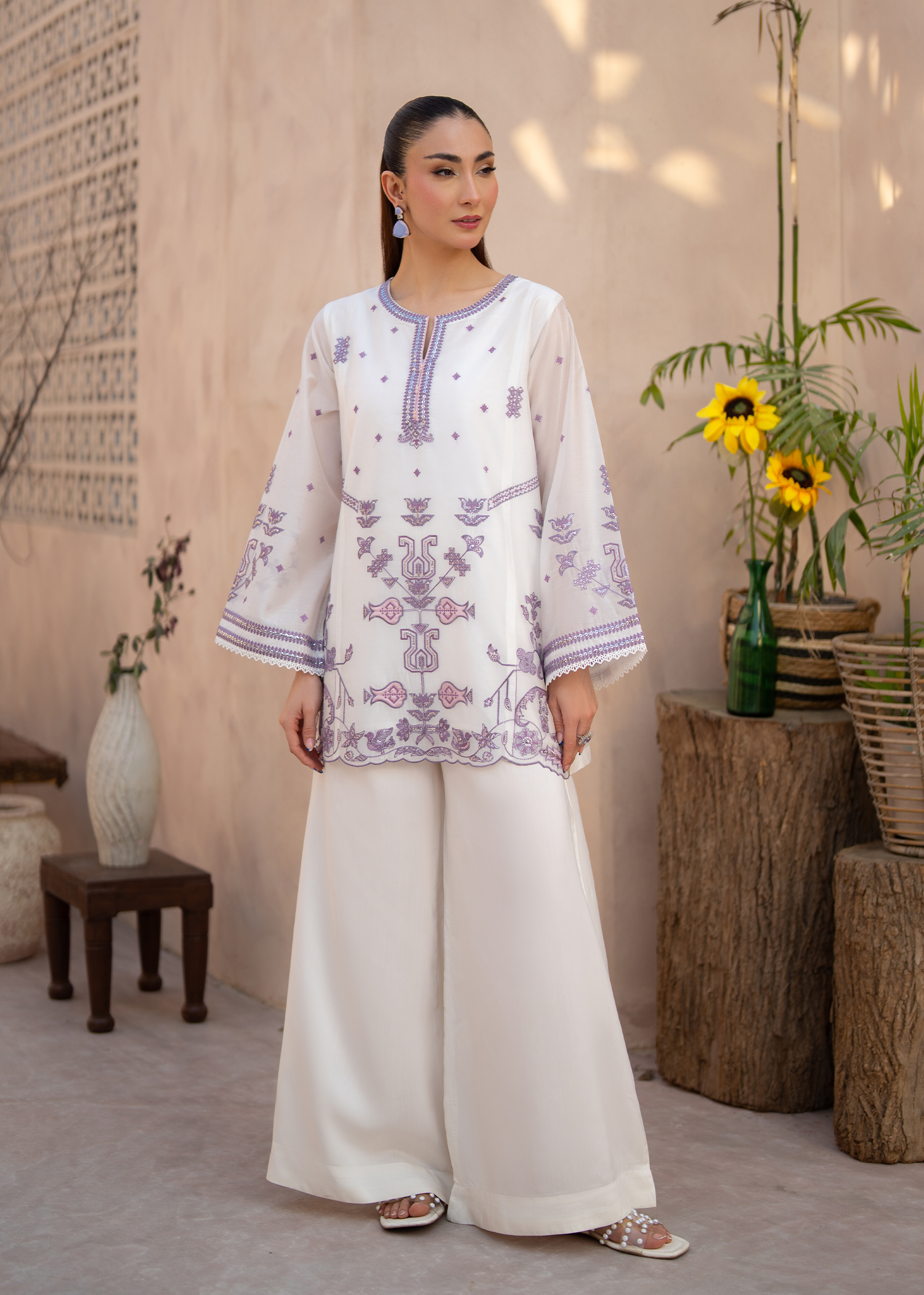 A refined two-piece luxury ensemble featuring a short A-line shirt paired with elegant flared trousers. The design is elevated by a modest V-slit crew neckline and intricate Ari-effect and cross-stitch embroidery adorning the front, neckline, and sleeves. Subtle sequins accents add a delicate shimmer, while lace-trimmed sleeve ends and a scalloped hem complete the look with graceful detail.