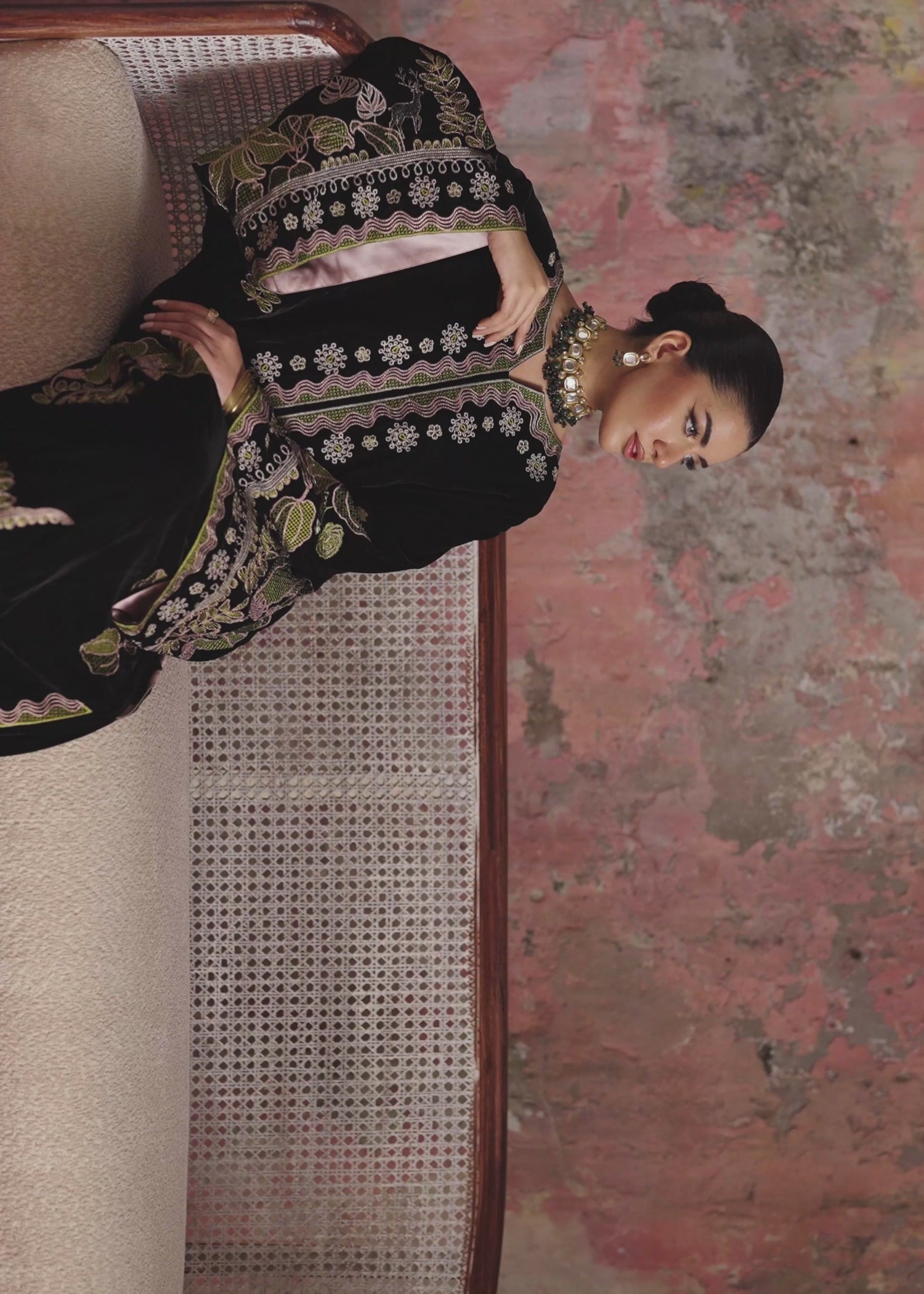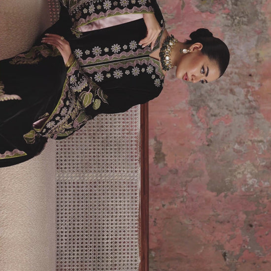 A masterpiece in black velvet, this kaftan is elevated with a striking non-traditional color palette that redefines festive elegance. The sleeves, hem, and neckline are richly embroidered, each detail reflecting meticulous craftsmanship. Tilla work is artfully applied to create the refined effect of cord-style embroidery, adding depth and dimension to the design. Crafted for the woman who dares to embrace distinction.