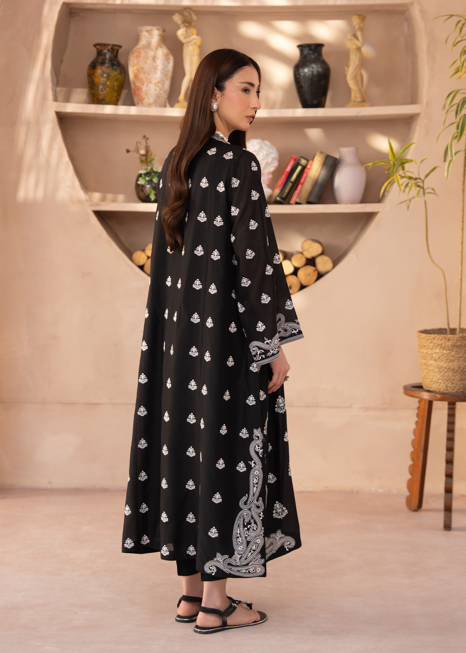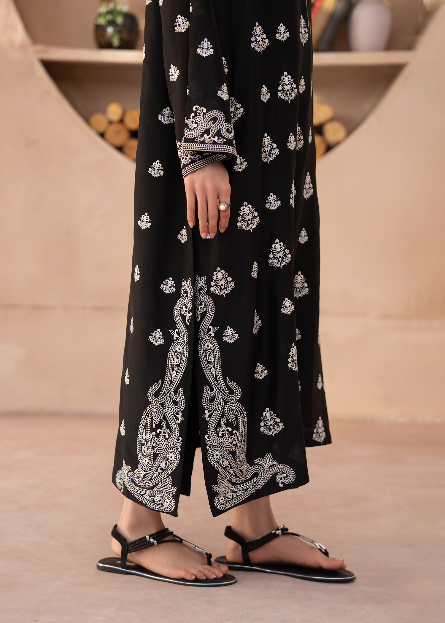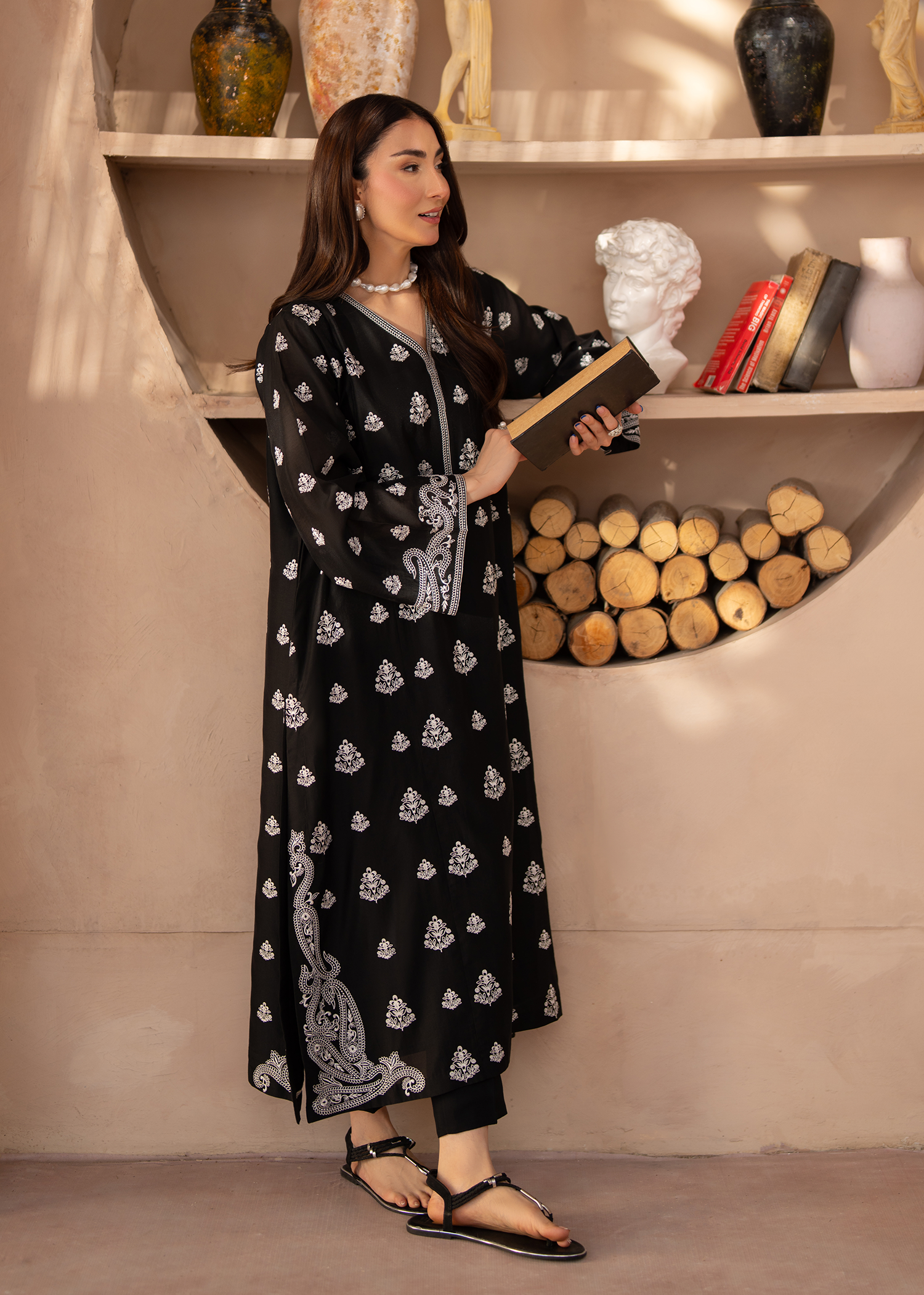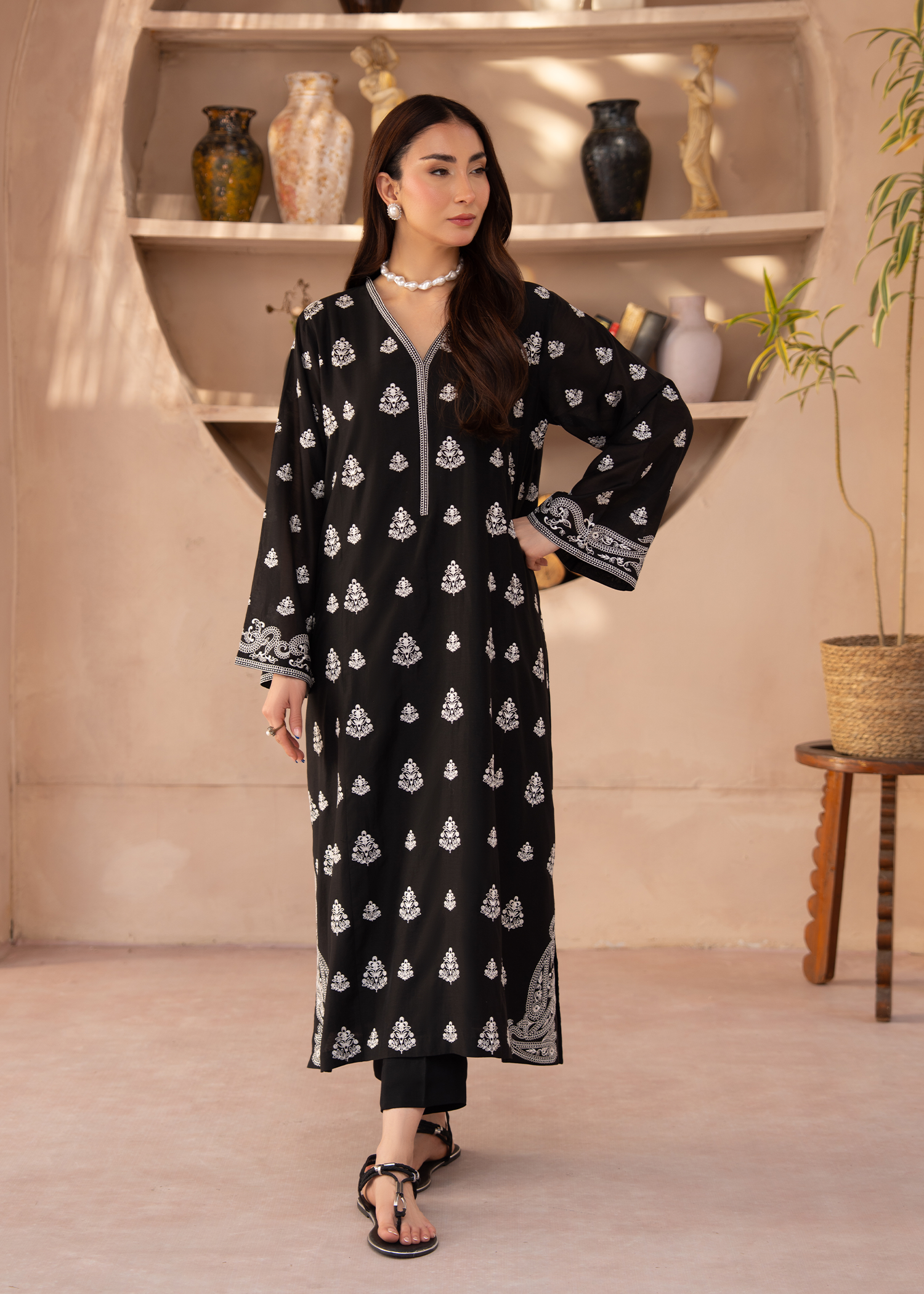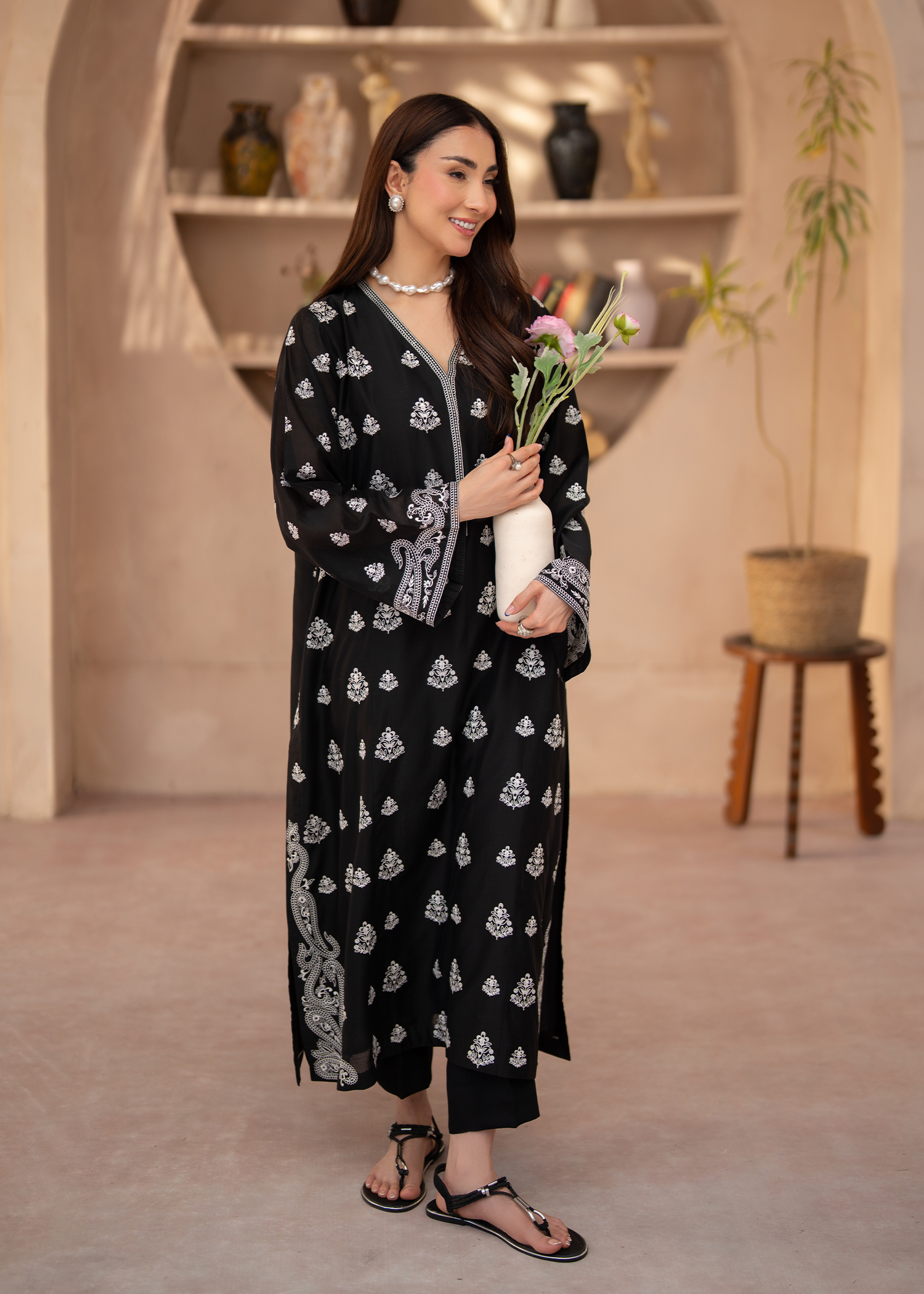 A sophisticated two-piece luxury ensemble featuring a relaxed A-line long shirt paired with straight-fit trousers. Crafted in black paper silk, the shirt showcases intricate white embroidery along the sleeve ends and hem, with delicate floral motifs adorning the entire front of the shirt and sleeves. A V-neckline with lace details and lace-trimmed sleeves add subtle elegance to this refined, contemporary silhouette.